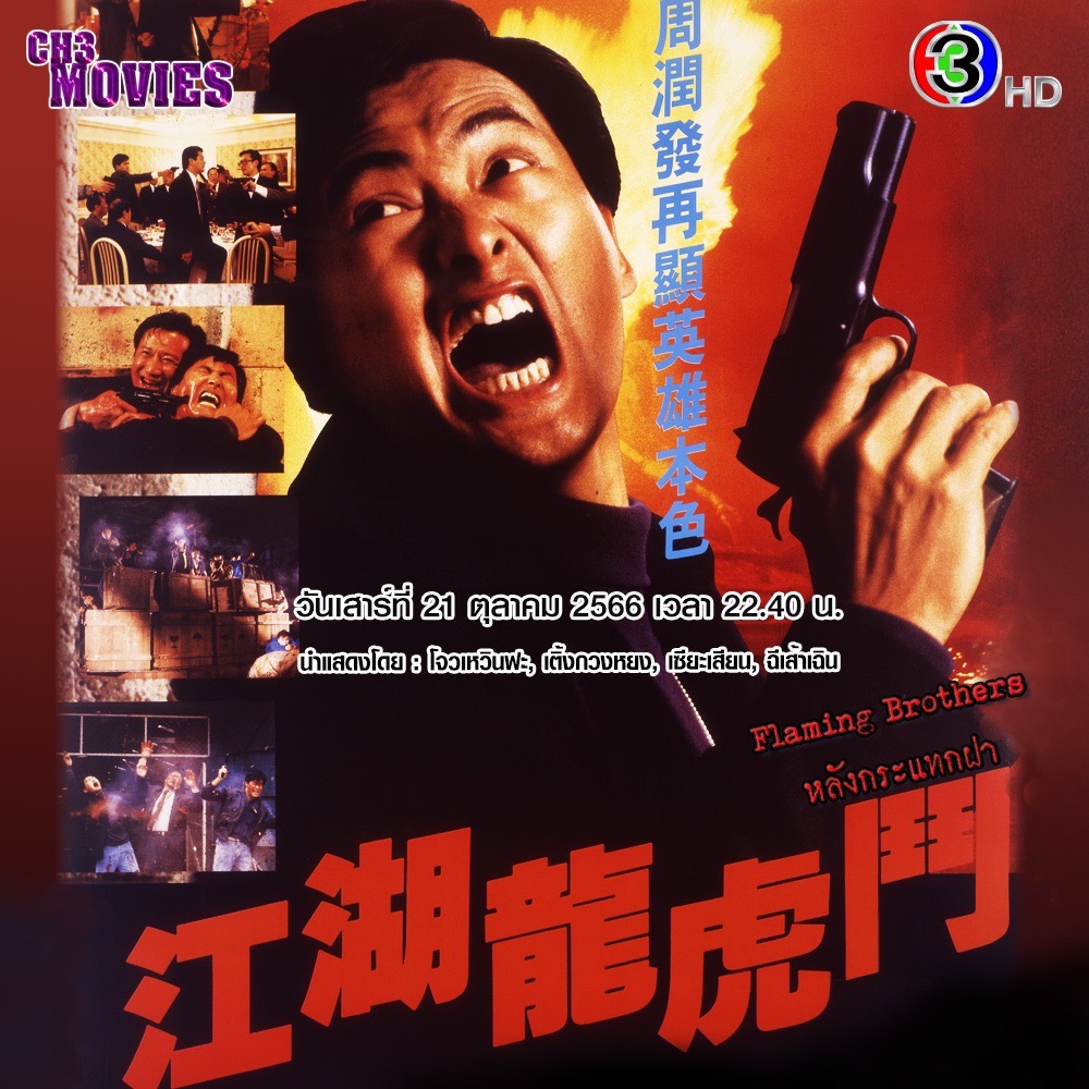 เจ้าพ่อนักบู๊โจวเหวินฟะ “แชนแนลทรีมูฟวี่ส์” เสนอภาพยนตร์ “หลังกระแทกฝา: Flaming Brothers” นำแสดงโดย โจวเหวินฟะ, เติ้งกวงหยง, เซียะเสียน, ฉีเส้าเฉิน เรื่องราวของ หลุน กับ เทียน เป็นเด็กกำพร้าที่เติบโตมาด้วยกัน หลุนกับเทียนสร้างตัวขึ้นมาเป็นเจ้าพ่อยิ่งใหญ่ในมาเก๊า เทียนได้พบกับ คาซี่ ซึ่งเคยให้อาหารเขากินในสมัยเด็ก ๆ เทียนตัดสินใจจะล้างมือเพื่อประกอบอาชีพสุจริต และแต่งงานกับคาซี่ หลุนเป็นห่วงความปลอดภัยของเทียน จึงจำใจตัดความสัมพันธ์กับเทียน แต่หลุนไปมีเรื่องกับ เจ้าพ่อใหญ่จนถึงขั้นตามฆ่ากัน หลุนต้องสูญเสียเจนนี่ คนรักไป หลุนให้เทียนไปจากฮ่องกง เพื่อกันไม่ให้เจ้าพ่อตามไปเล่นงานเทียนได้ แต่เทียนก็ตัดสินใจที่จะกลับไปช่วยหลุนที่มาเก๊า สองพี่น้องจับมือกันเล่นงานเจ้าพ่อเพราะไม่มีทางเลือกเขาทั้งสองจึงต้องเสียสละชีวิตเพื่อที่จะไปแก้แค้นเจ้าพ่อ ติดตามได้ใน “แชนแนลทรีมูฟวี่ส์” “หลังกระแทกฝา: Flaming Brothers” เวลา 22.40 น.