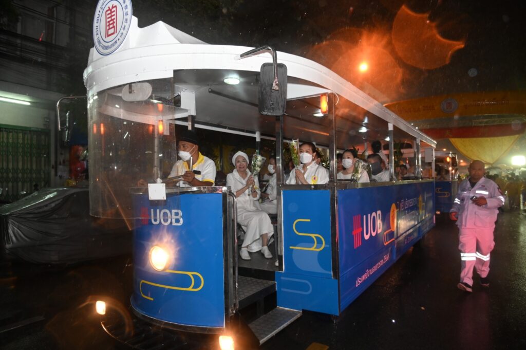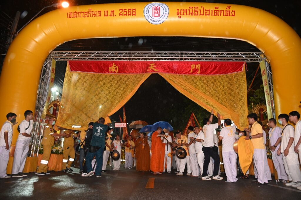 ขบวนแห่เวียนธูปของมูลนิธิป่อเต็กตึ๊ง ได้จัดซุ้มประตูมังกร เพื่อให้ขบวนต่างๆ ผ่านด้านหน้าศาลเจ้าไต้ฮงกง แต่ละขบวนตกแต่งสวยงาม นำด้วยกองธงชาติ ธงธรรมจักร และธงมูลนิธิฯ ตามด้วยขบวนป้ายผ้าเทศกาลกินเจ ชุดตั่วล่อโก้ว (ชุดขบวนกลองใหญ่) ชุดกระถางธูป และขบวนพระผู้ประกอบพิธี ตามด้วยผู้แสวงบุญหลายพันคนตามขบวน
