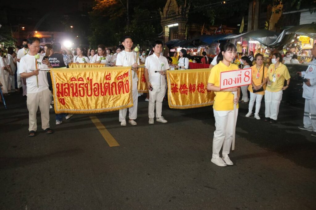 ขบวนแห่เวียนธูปของมูลนิธิป่อเต็กตึ๊ง ได้จัดซุ้มประตูมังกร เพื่อให้ขบวนต่างๆ ผ่านด้านหน้าศาลเจ้าไต้ฮงกง แต่ละขบวนตกแต่งสวยงาม นำด้วยกองธงชาติ ธงธรรมจักร และธงมูลนิธิฯ ตามด้วยขบวนป้ายผ้าเทศกาลกินเจ ชุดตั่วล่อโก้ว (ชุดขบวนกลองใหญ่) ชุดกระถางธูป และขบวนพระผู้ประกอบพิธี ตามด้วยผู้แสวงบุญหลายพันคนตามขบวน