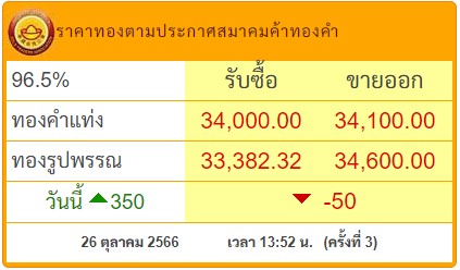 ราคาทองคำประจำวันที่ 26 ต.ค.2566 ปรับขึ้น 350 บาท เปรียบเทียบกับราคาสุดท้ายของวันที่ 25 ต.ค.ที่ผ่านมา โดยทองรูปพรรณขายออกที่บาทละ 34,600 บาท อ้างอิงข้อมูลล่าสุดจาก สมาคมค้าทองคำ ที่เผยแพร่ผ่านทางเว็บไซต์ เมื่อเวลา 09.25 น.ที่ผ่านมา
