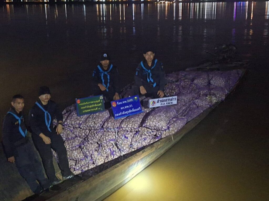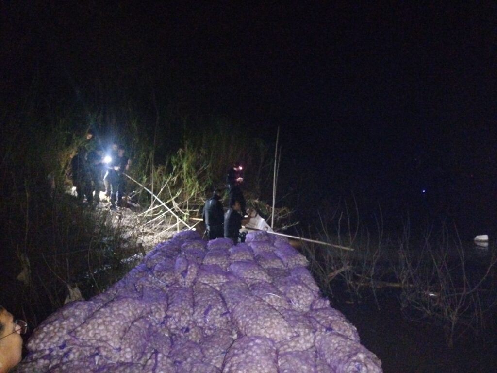 กระทั่งเวลา 02.45 จนท.ได้ตรวจพบบุคคลขับเรือเหล็กบรรทุกสินค้าหนีภาษี(กระเทียม)มาจอดบริเวณดังกล่าว จึงได้แสดงตนเข้าจับกุม เมื่อกลุ่มบุคคลพบเห็น จนท. ได้ทำการวิ่งหลบหนี อาศัยความมืดและชำนาญในพื้นที่หลบหนีไปได้ จนท.จึงได้ทำการตรวจสอบบริเวณรอบๆ มีรายละเอียดดังนี้