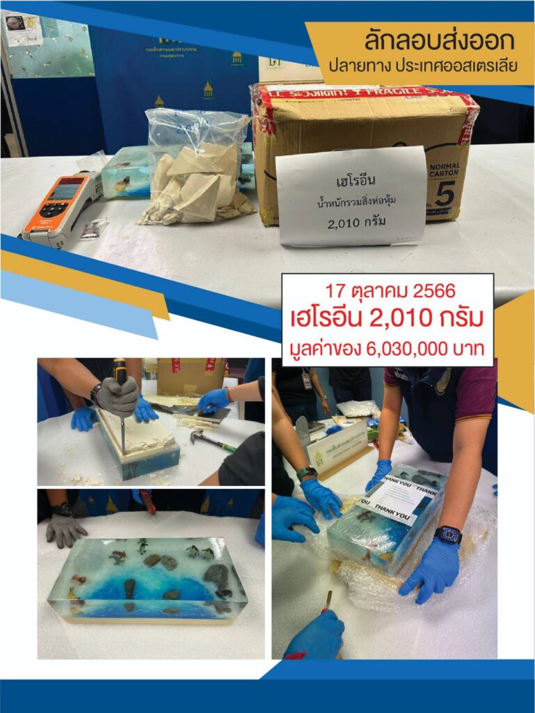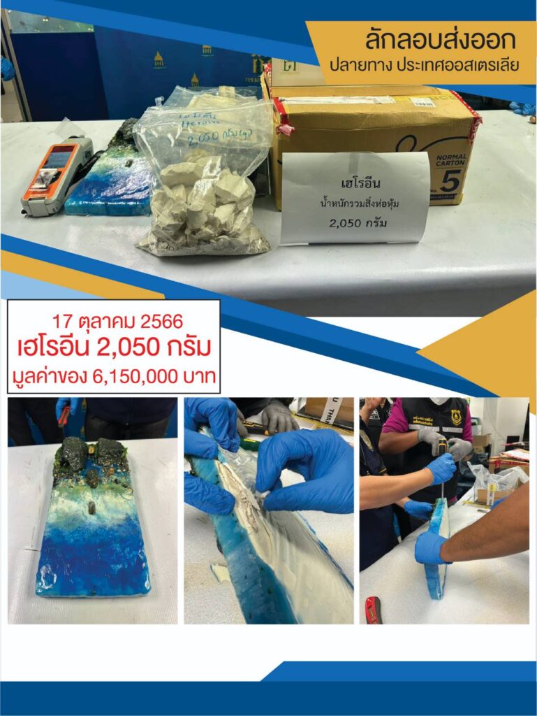 2.ตรวจยึดพัสดุขาออกระหว่างประเทศ เตรียมส่งไปยังประเทศออสเตรเลีย มีการสำแดง ชนิดสินค้าเป็นโมเดลทำด้วยเรซิ่น มีการซุกซ่อนยาเสพติดให้โทษ ประเภทที่ 1 เฮโรอีน (Heroine) ไว้ใต้ฐานรูปหล่อเรซิ่นที่มีการหล่อขึ้นมาใหม่ พบเฮโรอีน จำนวน 2,010 กรัม มูลค่า 6,030,000 บาท รวมตรวจพบเฮโรอีนทั้งสิ้น 4,060 กรัม มูลค่า 12,180,000 บาท