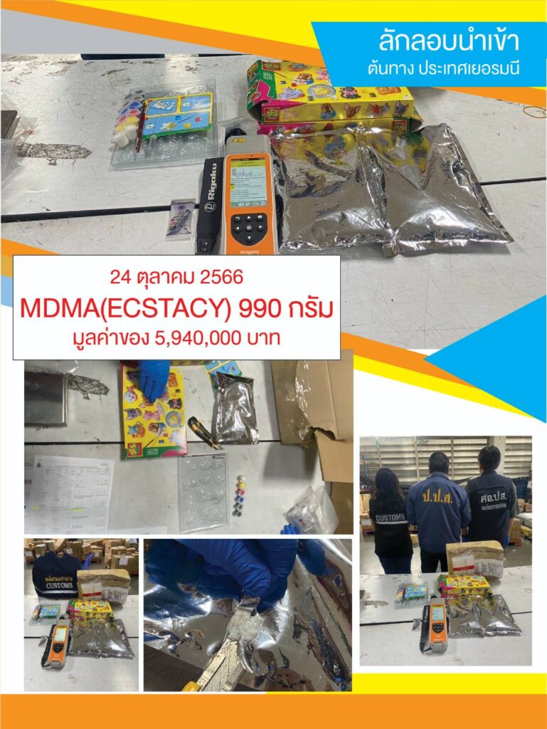 โดยเมื่อวันที่ 24 ตุลาคม 2566 เจ้าหน้าที่ศุลกากรและชุดปฏิบัติการ AITF ทำการวิเคราะห์ความเสี่ยงในการลักลอบนำเข้าของต้องห้ามต้องจำกัดเข้ามาในราชอาณาจักร พบพัสดุขาเข้าระหว่างประเทศ ประเทศต้นทางจากเยอรมนี สำแดงชนิดสินค้าเป็นของเล่น มีความเสี่ยงสูงจึงทำการเปิดตรวจกล่องพัสดุ พบยาเสพติดให้โทษประเภทที่ 1 MDMA (ECSTACY) ซุกซ่อนในซองพลาสติกทึบแสงสีเงิน และอยู่ภายในกล่องของเล่น จำนวน 990 กรัม รวมมูลค่าประมาณ 5,940,000 บาท ซึ่งภายหลังการตรวจยึด ชุดปฏิบัติการ AITF ได้พยายามดำเนินการขยายผลไปยังผู้รับพัสดุดังกล่าว แต่ผู้รับไหวตัวไม่แสดงตนรับพัสดุจึงยกเลิกภารกิจดังกล่าว และนำของกลางที่ตรวจยึดส่งพนักงานสอบสวนต่อไป