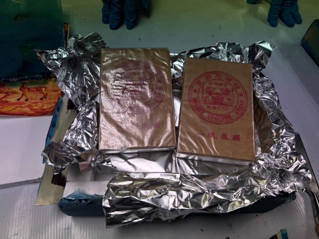 2.สำแดงชนิดสินค้าเป็นภาพโปสเตอร์ มีการซุกซ่อนยาเสพติดให้โทษ ประเภทที่ 1 เฮโรอีน (Heroine) ไว้ภายในภาพ น้ำหนักรวมสิ่งห่อหุ้ม 770 กรัม รวมมูลค่ากว่า 2,310,000 บาท