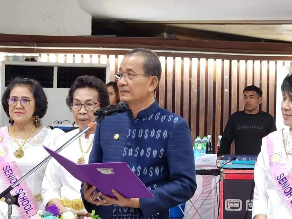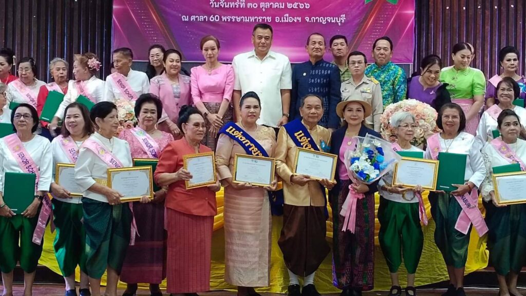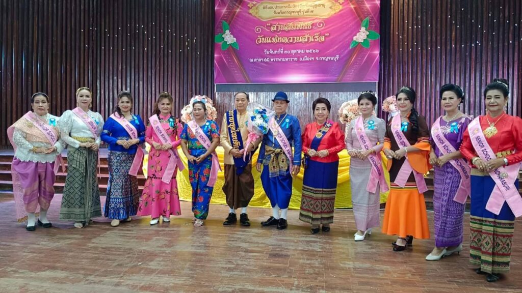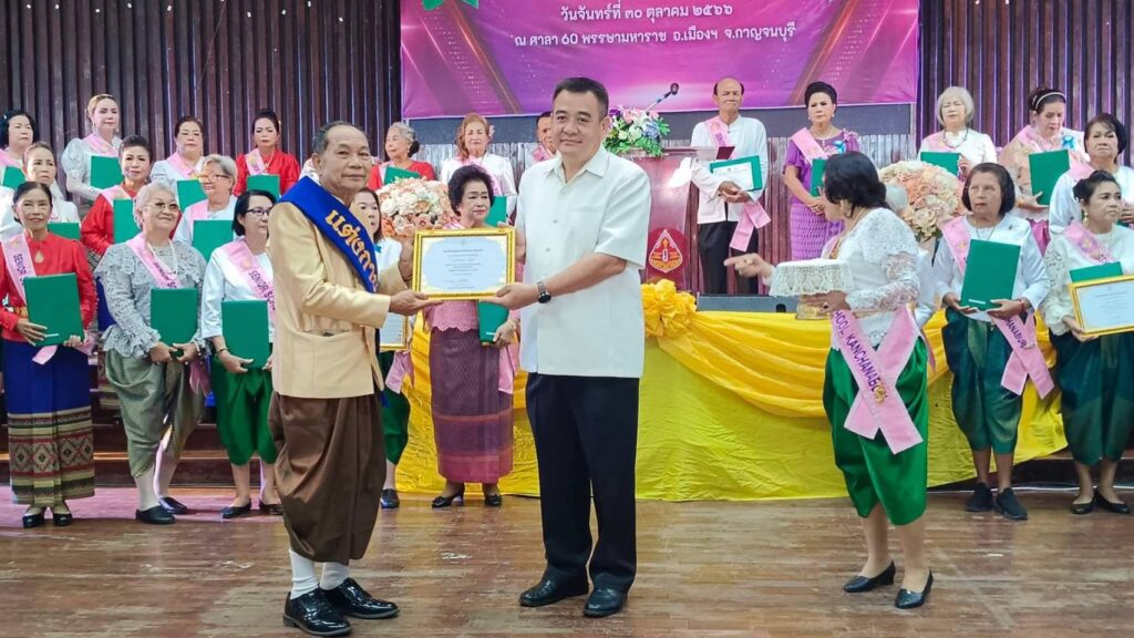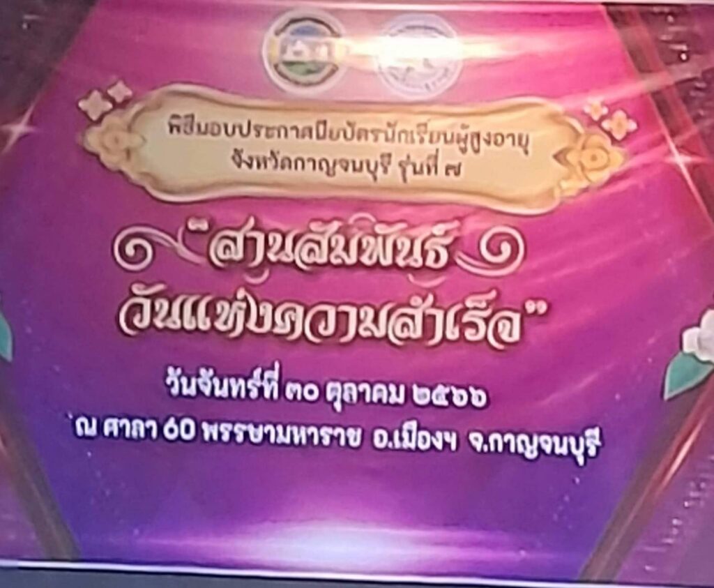 วันที่ 30 ตุลาคม 2566 เวลา08.30น. ณ ศาลา 60 พรรษามหาราช อำเภอเมือง จังหวัดกาญจนบุรี นายปกรณ์ กรรณวัลลี ปลัดจังหวัดกาญจนบุรี ประธานในพิธีมอบประกาศนียบัตรแก่นักเรียนผู้สูงอายุ รุ่นที่ 7 และมอบประกาศเกียรติคุณแก่ผู้บริจาคเงินสมทบทุนการจัดงาน โดย พล.ต.ต.กมลสันติ กลั่นบุศย์ ผู้อำนวยการโรงเรียนผู้สูงอายุ กล่าวต้อนรับและวัตถุประสงค์ ฯพร้อมด้วยนางกระแสร์ ขำจิตต์ รองผู้อำนวยการโรงเรียนผู้สูงอายุจังหวัดกาญจนบุรี ดร.กิรดา ลำโครัตน์ ท่องเที่ยวและกีฬาจังหวัดกาญจนบุรี นางสมมารถ คำถนอม วัฒนธรรมจังหวัดกาญจนบุรี แขกผู้มีเกียรติ คณะครู อาจารย์ วิทยากรจิตอาสา และนักเรียนผู้สูงอายุ เข้าร่วมพิธี “สานสัมพันธ์ วันแห่งความสำเร็จ” นักเรียนผู้สูงอายุ รุ่นที่ 7