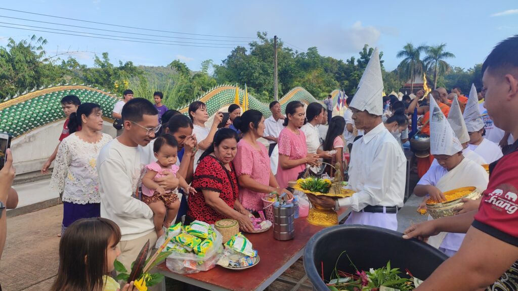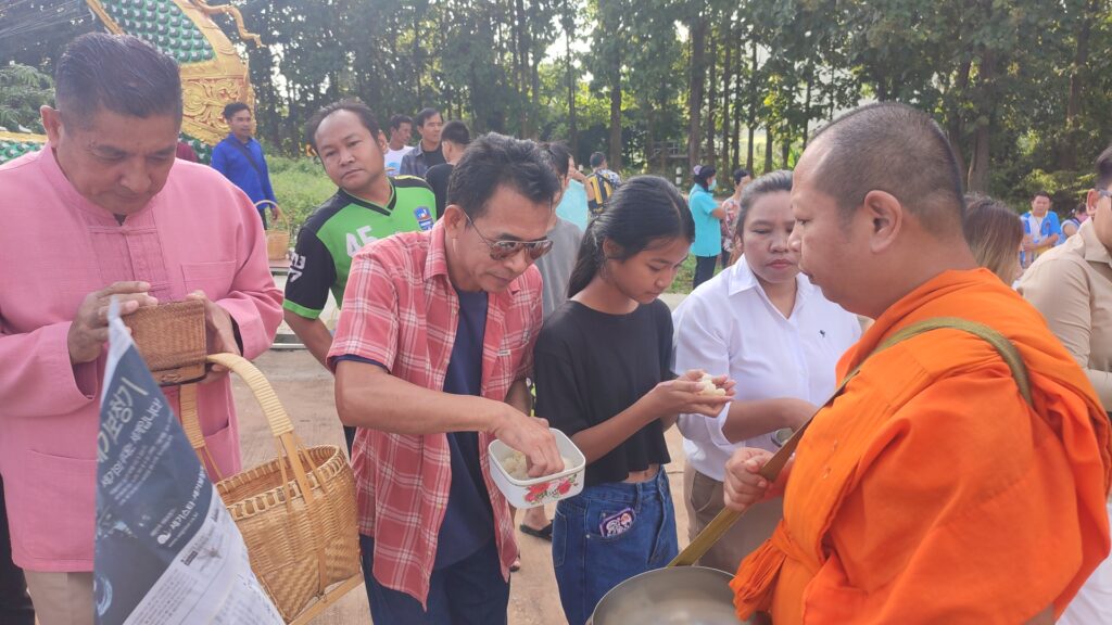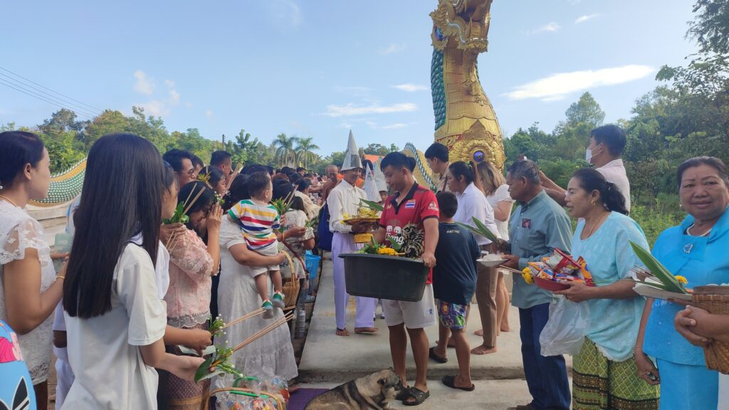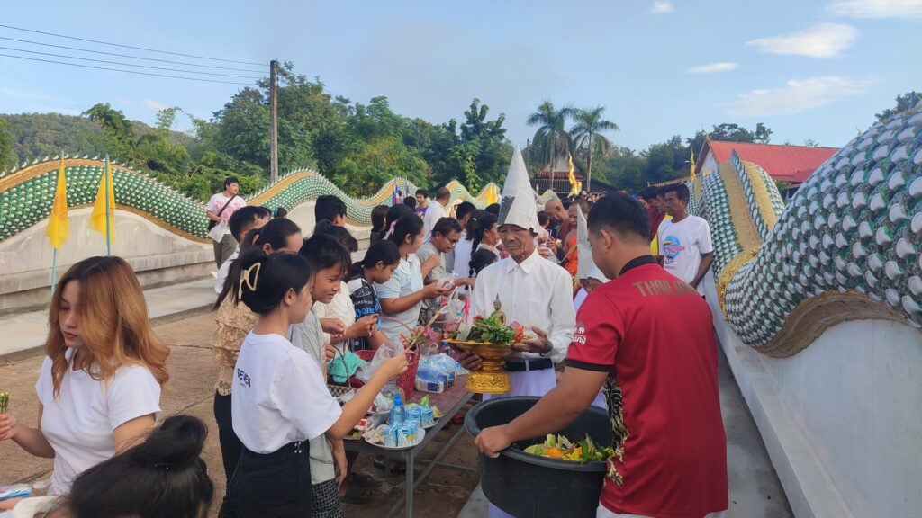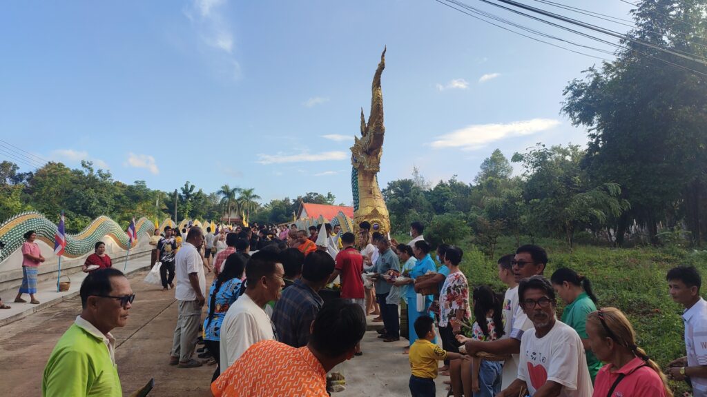 พระสงฆ์จำนวน 5 รูป ร่วมบิณฑบาต และพุทธศสนิกชน พร้อมกับขบวนอัญเชิญพระพุทธรูป และ พระภิกษุสงฆ์ สามเณร ลงจากวัด เดินขึ้นทางเข้าวัดโดยมีรูปปั้นพญานาคสององค์อยู่ข้างทางขึ้นอย่างสวยงาม และเพื่อความเป็นสิริมงคลแก่ตนเองและครอบครัว รวมถึงการร่วมกันสืบสานวัฒนธรรมประเพณีอันดีงาม อีกทั้งเป็นการส่งเสริมรักษาประเพณีการทำบุญตักบาตร เทโวโรหณะ ที่ปฏิบัติสืบทอดกันมาตั้งแต่โบราณให้คงอยู่สืบสานต่อรุ่นลูกรุ่นหลานต่อไป