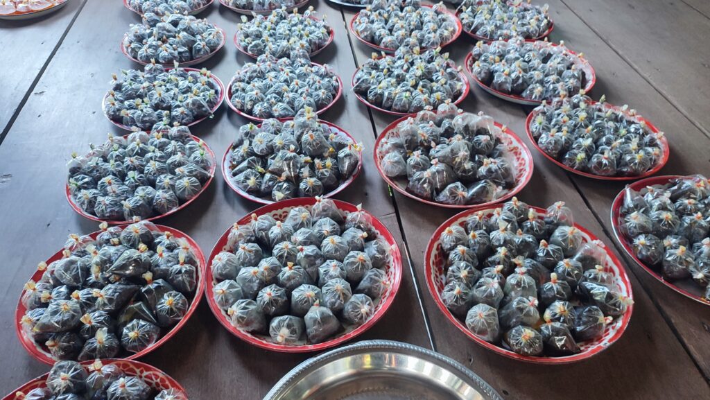 ทั้งนี้ยังมีการแจกจ่ายข้าวทิพย์ เป็นพิธีกรรมของศาสนาพราหมณ์ที่ปะปนกับพิธีกรรมของศาสนาพุทธ โดยอ้างถึงเหตุการณ์ในสมัยพุทธกาลที่นางสุชาดาได้ปรุงข้าวมธุปายาสถวายพระโคตมพุทธเจ้าก่อนที่พระองค์จะตรัสรู้ ถือกันว่าข้าวมธุปายาสเป็นของทิพย์ เมื่อได้จัดทำขึ้นจึงเรียกว่า ข้าวทิพย์ ชาวบ้านจะทำในเทศกาลออกพรรษา เพื่อถวายพระสงฆ์แล้ว และส่วนที่เหลือนำมาแจกให้ชาวบ้านนำมารับประทานเพื่อเป็นศิริมงคลแก่ครอบครัว