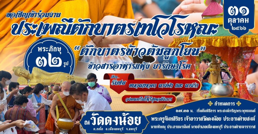 วันที่ 31 ตุลาคม 2566 เวลา 07.30 น. ณ วัดดงน้อย ตำบลกกโก อำเภอเมือง จังหวัดวัดลพบุรี พระครูจันทสิริธร “หลวงพ่อสารันต์” เจ้าอาวาสวัดดงน้อย ประธานฝ่ายสงฆ์ นายพิษณุ ประภาธนานันท์ นายอำเภอเมืองลพบุรี เป็นประธานฝ่ายฆราวาส นำพุทธศาสนิกชนพร้อมใจร่วมทำบุญตักบาตรเทโวโรหณะ “ตักบาตรข้าวต้มลูกโยน” ข้าวสารอาหารแห้ง ยารักษาโรค เนื่องในเทศกาลวันออกพรรษา ประจำปี พ.ศ.2566 โดยจัดรูปขบวนให้มีผู้แต่งกายเป็น เทวดา พระอินทร์ นางฟ้า เดินนำพระสงฆ์ ลงมาจาก พระพุทธไสยาสน์องค์ใหญ่ที่สุดของจังหวัดลพบุรี ที่มีความยาว 45 เมตร กว้าง 4 เมตร และสูง 16 เมตร ซึ่งเป็นที่เลื่อมใส่ศรัทธาของพุทธศาสนิกชนทั่วไปรวมถึงเป็นการส่งเสริมการท่องเที่ยวตามวิถีไทย วิถีพุทธ เนื่องในเทศกาลวันออกพรรษา ซึ่งพระสงฆ์ได้เดินลงเพื่อมารับบิณฑบาตจากพุทธศาสนิกชนที่มายืนรอใส่บาตรกันอย่างเนื่องแน่น