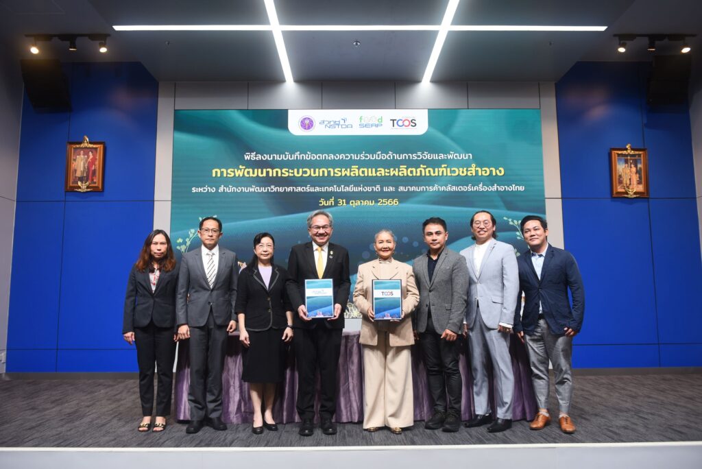 วันที่ 31 ตุลาคม 2566 ณ ห้องแถลงข่าว ชั้น 1 กระทรวง อว. : สำนักงานพัฒนาวิทยาศาสตร์และเทคโนโลยีแห่งชาติ (สวทช.) ภายใต้กระทรวงการอุดมศึกษา วิทยาศาสตร์ วิจัยและนวัตกรรม (อว.) จัดพิธีลงนามบันทึกข้อตกลงความร่วมมือด้านการวิจัยและพัฒนา เรื่อง การพัฒนากระบวนการผลิตและผลิตภัณฑ์เวชสำอาง โดยมี ศาสตราจารย์ ดร.ชูกิจ ลิมปิจํานงค์ ผู้อํานวยการสํานักงานพัฒนาวิทยาศาสตร์และเทคโนโลยีแห่งชาติ นางลักษณ์สุภา ประภาวัต นายกสมาคมการค้าคลัสเตอร์เครื่องสำอางไทย หรือ TCOS (Thai Cosmetic Cluster) ร่วมลงนาม และดร.กัลยา อุดมวิทิต รักษาการผู้ช่วยผู้อำนวยการสำนักงานพัฒนาวิทยาศาสตร์และเทคโนโลยีแห่งชาติ (สวทช.) พร้อมด้วย ดร.ธนธรรศ สนธีระ อุปนายกสมาคมการค้าคลัสเตอร์เครื่องสำอางไทย เป็นพยานในความร่วมมือครั้งนี้ เพื่อร่วมกันสร้างความเข้มแข็งและเสริมศักยภาพให้กับผู้ประกอบการไทยในกลุ่มอุตสาหกรรมสุขภาพและความงาม ด้วยการใช้ประโยชน์จากผลงานวิจัยพัฒนาชั้นนำของประเทศและบริการโครงสร้างพื้นฐานด้านวิทยาศาสตร์เทคโนโลยีตามหลักมาตรฐานสากล สู่การพัฒนาประเทศอย่างยั่งยืน