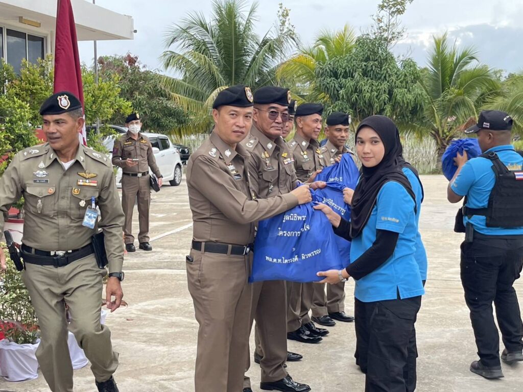 จากนั้นเวลา 10.30 น.ที่ ลานอเนกประสงค์หน้าอาคาร พฐ.จ.นราธิวาส “มูลนิธิพระราหู” นำโดย พล.ต.ท.ไตรรงค์ ผิวพรรณ ผบช.กมค.รรท.ผบช.สพฐ.ตร. พร้อมด้วย พล.ต.ต.วิสูตร นาคจู ผบก.ศพฐ.9 รรท. รอง ผบช.สพฐ.ตร,พ.ต.อ.ทิวา โสภาเจริญ รอง ผบก.สปพ.,พ.ต.อ.กฤตัชญ์ บำรุงรัตนยศ รอง ผบก.สอท.1,พ.ต.อ.สราวุธ จงจิต นวท.(สบ 5) ศพฐ.10 ได้ร่วมมอบถุงยังชีพให้แก่ข้าราชการตำรวจ จำนวน 35 ถุง รวมเป็นเงินทั้งสิน 17,500 บาท