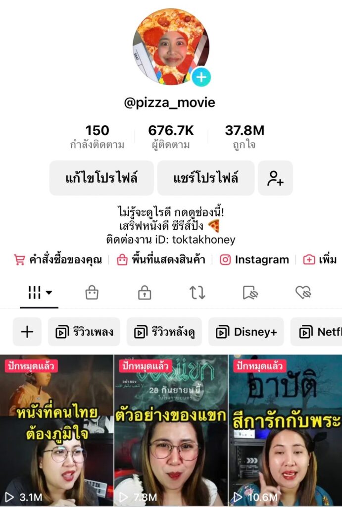 @@@ถ้าพูดถึง pizza movie และเห็นใบหน้าลีลาการแนะนำหนังและซีรีส์ของเธอแล้ว ทุกคนจะต้องหยุดดูผู้หญิงคนนี้ ด้วยลีลาการเล่าเรื่องอินเนอร์แบบใส่เต็มไม่มียั้ง เสมือนเม้าส์ให้เพื่อนฟังเอกลักษณ์นี้จึงทำให้ช่องของเธอ มีคนกดถูกใจมากถึง 38 ล้านคน และ มีผู้ติดตามช่องtiktok ว่าครึ่งล้าน