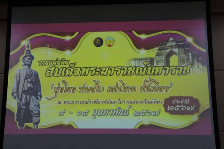 เวลา 13.00 วันอังคารที่ 7 พฤศจิกายน 2566 ที่ห้องประชุมพระปรางค์สามยอด ชั้น 4 ศาลากลางจังหวัดลพบุรี นายปรัชญา เปปะตัง รองผู้ว่าราชการจังหวัดลพบุรี เป็นประธานการประชุมคณะกรรมการประชาสัมพันธ์ การจัดงานแผ่นดินสมเด็จพระนารายณ์มหาราช ครั้งที่ 36 ประจำปี 2567 ทั้งนี้เพื่อชี้แจงการจัดงานแผ่นดินสมเด็จพระนารายณ์มหาราช ซึ่งกำหนดจัดขึ้นระหว่างวันที่ 9 – 18 กุมภาพันธ์ 2567 โดยจัดกิจกรรมภายในพระนารายณ์ราชนิเวศน์และโบราณสถานใกล้เคียงรวมถึงแนวทางการประชาสัมพันธ์การจัดงานแผ่นดินสมเด็จพระนารายณ์มหาราชผ่านสื่อประเภทต่างๆ ซึ่งในปีนี้การจัดงานจะยิ่งใหญ่กว่าทุกปี เพราะเป็นปีมหามงคลเนื่องในโอกาสวันเฉลิมพระชนมพรรษาพระบาทสมเด็จพระเจ้าอยู่หัว 6 รอบ 72 พรรษา