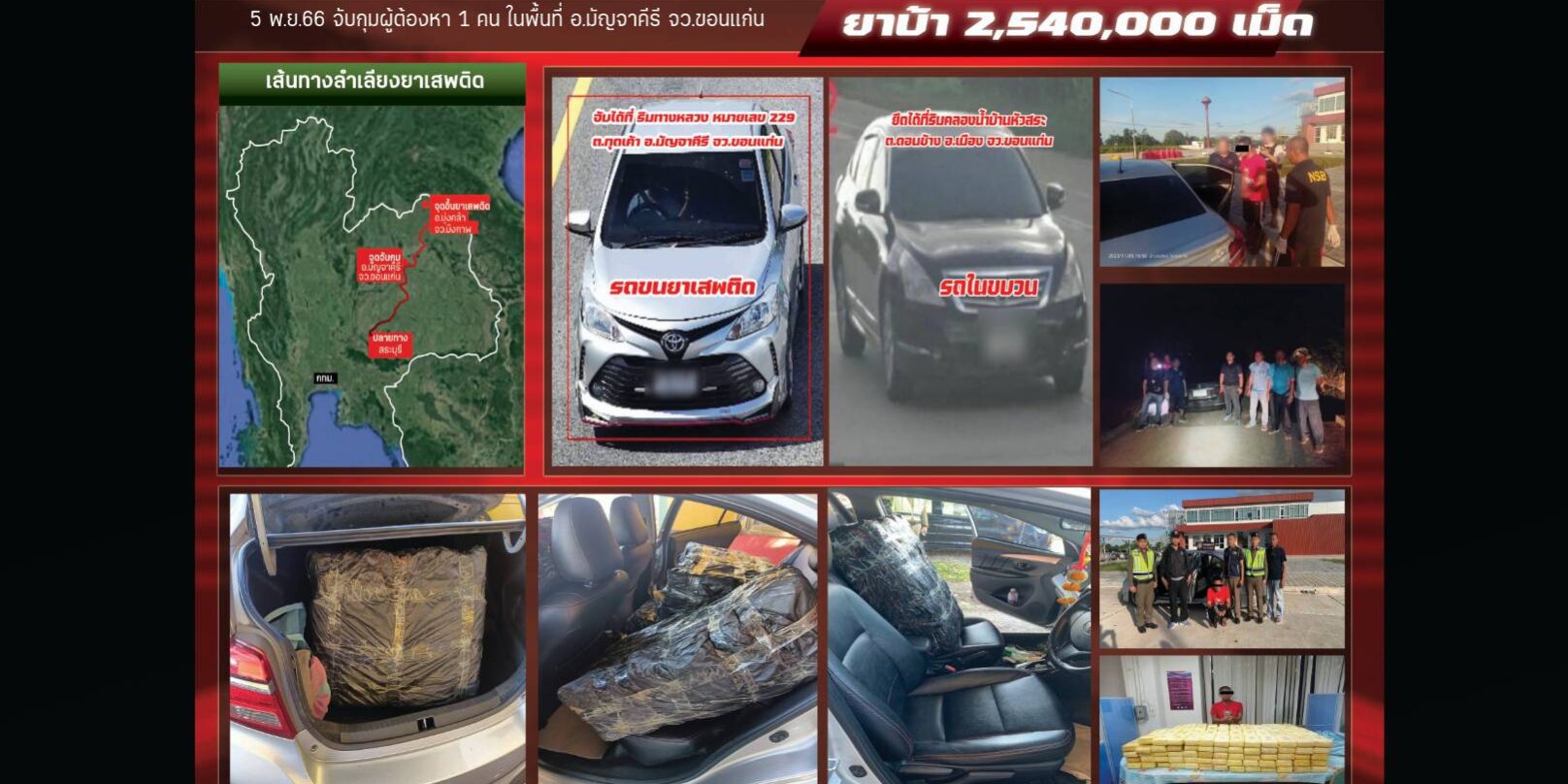 คดีที่ 2 ตำรวจ ปส.2 ร่วมกับ ตำรวจทางหลวง ได้ทำการสืบสวนขยายผลหลังจับกุมขบวนการค้ายาเสพติด และทราบว่าจะมีการลำเลียงยาเสพติดจากชายแดนภาคตะวันออกเฉียงเหนือตอนบน ไปส่งลูกค้าในเขตพื้นที่ตอนใน โดยใช้รถยนต์หมายเลขทะเบียน Xกฒ 40XX กทม. และ หมายเลขทะเบียน กต 64XX ราชบุรี ลำเลียงยาเสพติด เจ้าหน้าที่จึงสืบสวนและเฝ้าติดตาม กระทั่งกลางดึกของวันที่ 4 พ.ย.2566 พบรถยนต์เป้าหมายทั้งสองคัน ในเขตพื้นที่ จ.สกลนคร ขับตามกันมุ่งหน้า จ.อุดรธานี ต่อเนื่อง จ.ขอนแก่น เมื่อรถยนต์เป้าหมายทั้งสองคันขับขี่เข้ามาพื้นที่ อ.เมือง จ.ขอนแก่น ตำรวจจึงแสดงตัวเพื่อเข้าทำการตรวจสอบ แต่รถเป้าหมายได้อาศัยความชำนาญพื้นที่ขับหลบหนี ชุดจับกุมจึงประสานตำรวจทางหลวงตั้งจุดตรวจจุดสกัดในเขตพื้นที่และข้างเคียง กระทั่งเวลา 03.15 น. ของวันที่ 5 พ.ย.2566 ตำรวจทางหลวง 2 กก.4 แจ้งว่าพบว่าพบรถเป้าหมายบริเวณริมทางหลวงหมายเลข 229 ต.กุดเค้า อ.มัญจาคีรี จว.ขอนแก่น จึงนำกำลังเข้าตรวจสอบพบ นายธนัตชัย เป็นผู้ขับขี่ ตรวจค้นภายในรถพบยาบ้า 2,540,000 เม็ด ส่วนรถยนต์อีก 1 คัน ถูกจอดทิ้งอยู่บริเวณข้างคลองน้ำบ้านหัวสระ ต.ดอนช้าง อ.เมือง จ.ขอนแก่น ในสภาพยางล้อหลังซ้ายแตก ตรวจสอบไม่พบบุคคลหรือสิ่งของที่ผิดกฎหมายแต่อย่างใด