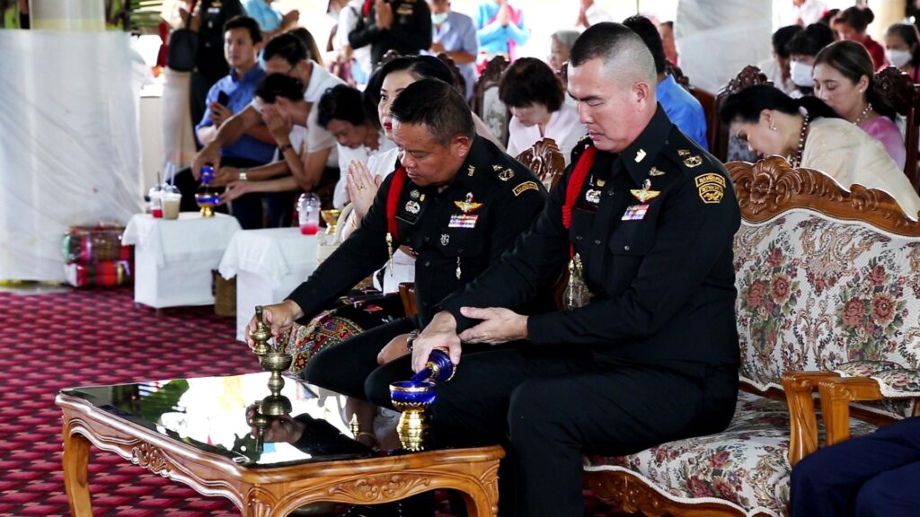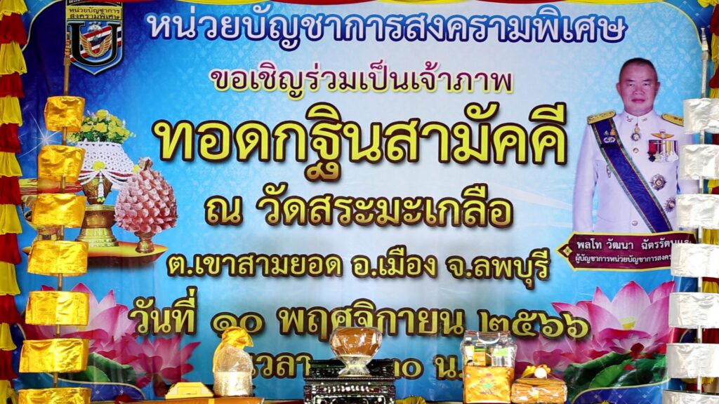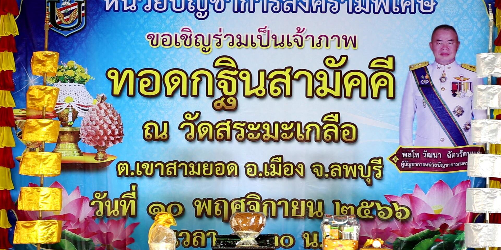 พลตรี ณรงค์ฤทธิ์ คัมภีระ รองผู้บัญชาการหน่วยบัญชาการสงครามพิเศษ ค่ายสมเด็จพระนารายณ์มหาราช จังหวัดลพบุรี เป็นผู้แทน ผู้บัญชาการหน่วยบัญชาการสงครามพิเศษ เป็นประธาน นำกำลังพลหน่วยรบพิเศษ และครอบครัว ตลอดจนเหล่าพุทธศาสนิกชน จากชุมชนต่างๆ ในพื้นที่จังหวัดลพบุรี และจังหวัดใกล้เคียง พร้อมใจกันเข้าร่วมประเพณีทอดถวายผ้ากฐินสามัคคี ทหารหน่วยรบพิเศษ ประจำปี 2566 ณ วัดสระมะเกลือ ตำบลเขาสามยอด อำเภอเมือง จังหวัดลพบุรี โดยมี พระครูสุวัฒน์กิตติสาร (จรัญ สารีโท) เจ้าคณะตำบลเขาสามยอด เจ้าอาวาสวัดสระมะเกลือ เป็นประธานฝ่ายสงฆ์