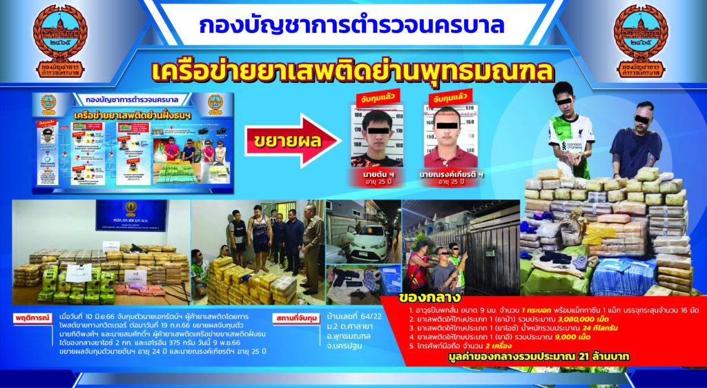 เมื่อวันพฤหัสบดีที่ 9 พ.ย.2566 เวลา 13.00 น.ณ ลานแถลงข่าส บช.น. : พล.ต.ต.ทินกร รังมาตย์ รรท.รอง ผบช.น. พร้อมด้วย พ.ต.อ.นริศ ปรารถนาพร รอง ผบก.น.6,นายอุดมชัย โลหะณุต ผู้อำนวยการสำนักงาน ป.ป.ส. และเจ้าหน้าที่ตำรวจฝ่ายสืบสวนนครบาล 6 ร่วมแถลงข่าวกรณี จับกุมผู้ต้องหาชาย 2 รายผลการร่วมจับกุมยาเสพติดย่านพุทธมณฑล พร้อมของกลาง อาวุธปืนพกสั้น ยี่ห้อซิกซาวเออร์ ขนาด 9 มม. จำนวน 1 กระบอก พร้อมแม๊กกาซีน 1 แม๊ก (บรรจุกระสุน 16 นัด) ยาบ้า 3,080,000 เม็ด ยาไอซ์ 24 กิโลกรัม ยาอี 9,000 เม็ด และโทรศัพท์มือถือ 2 เครื่อง
