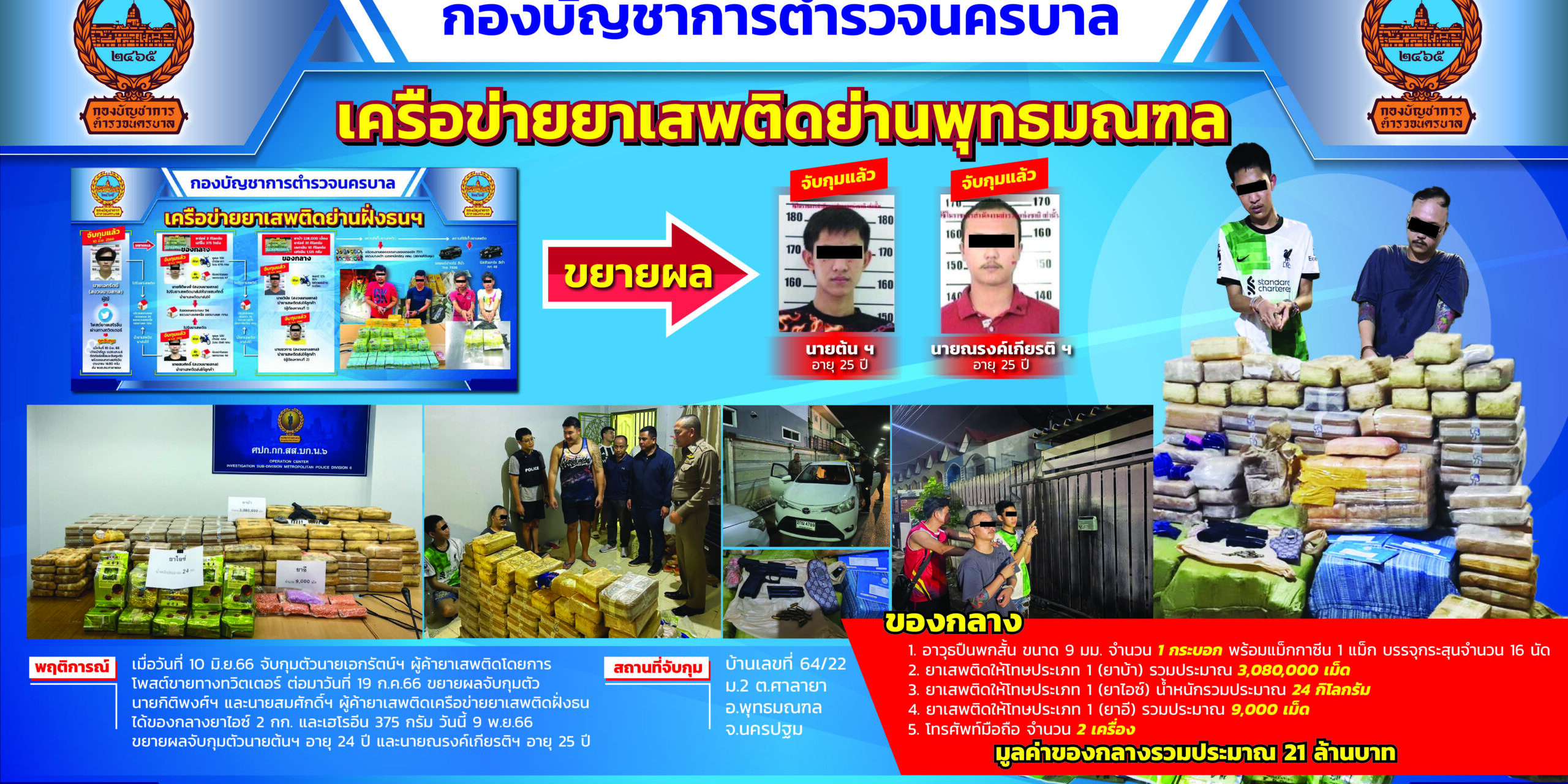 พฤติการณ์กล่าวคือ เมื่อวันที่ 10 มิ.ย.66 เจ้าหน้าที่ตำรวจสืบสวนผู้ค้ายาเสพติดทางสื่อออนไลน์ จนสามารถจับกุมนายเอกรัตน์ฯ ผู้ค้ายาเสพติดโดยการโพสต์ขายทางทวิตเตอร์ ต่อมาเมื่อวันที่ 19 ก.ค.2566 ได้สืบสวนขยายผลจับกุมตัวนายกิติพงศ์ฯ, นายสมศักดิ์ฯ กับพวกรวม 4 คน ผู้ค้ายาเสพติดเครือข่ายฝั่งธน ได้ของกลางยาบ้า 228,800 เม็ด,ไอซ์ 33 กก.,เคตามีน 36 กก.,เฮโรอีน 1 กก. จึงได้ทำการขยายผลจากนายกิติพงศ์ฯ ผู้ต้องหา ได้มารับยาเสพติดที่บริเวณในเขตพื้นที่ อ.พุทธมณฑล จ.นครปฐม เจ้าหน้าที่ตำรวจจึงได้สืบสวน เฝ้าสะกดรอย ติดตามพิสูจน์ทราบตัวบุคคลคือนายต้นฯ และ นายณรงค์เกียรติฯ ที่นำยาเสพติดมาส่งให้ นายกิติพงศ์ฯ และทราบสถานที่เก็บยาเสพติดอยู่ที่ย่านพุทธมณฑล