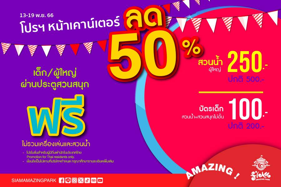 เดือดจัดกับโปรฯออนไลน์ ลดไฟลุกสูงสุดเป็นปรากฏการณ์ถึง 70% บัตรผู้ใหญ่รายวัน รวมทุกอย่าง ผ่านประตู+เล่นสวนน้ำ+สวนสนุก ไม่จำกัดรอบ เพียง 300 บาท จากปกติ 1,000 บาท ด่วน! โปรฯนี้มีจำนวนจำกัด 5,000 คน จองล่วงหน้าถึง 16 พ.ย.นี้ เท่านั้น! เที่ยวสวนน้ำอย่างเดียว เหลือเพียง 200 บาท จากปกติ 500 บาท เลือกใช้บริการระหว่าง 13 – 19 พ.ย.66 คลิ้กเลยที่ https://www.siamamazingpark. com/ หรือสอบถามรายละเอียดเพิ่มเติมที่ www.facebook.com/siamamazingpark