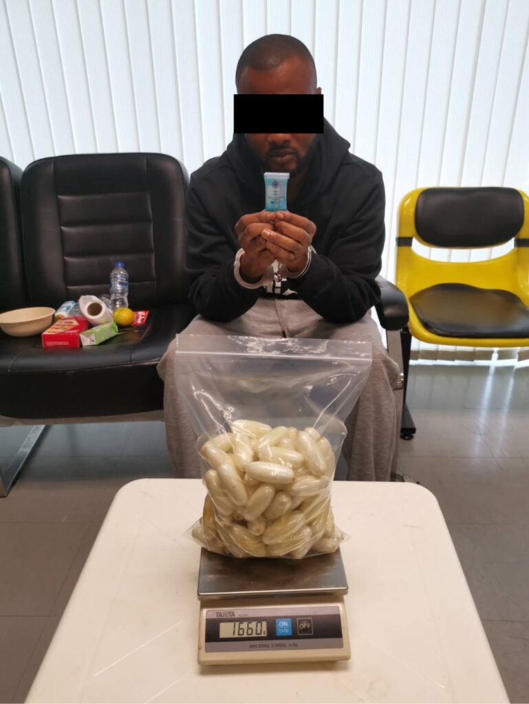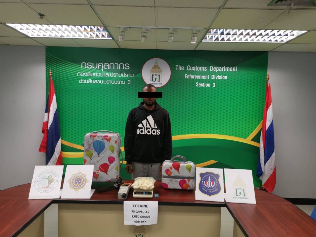 กรมศุลกากรจับชายชาวไอวอเรียน ซ่อนโคคาอีนในร่างกายโดยการกลืน น้ำหนัก 1,660 กรัม มูลค่ากว่า 4.9 ล้านบาท ณ สำนักงานศุลกากรตรวจของผู้โดยสารท่าอากาศยานสุวรรณภูมิ