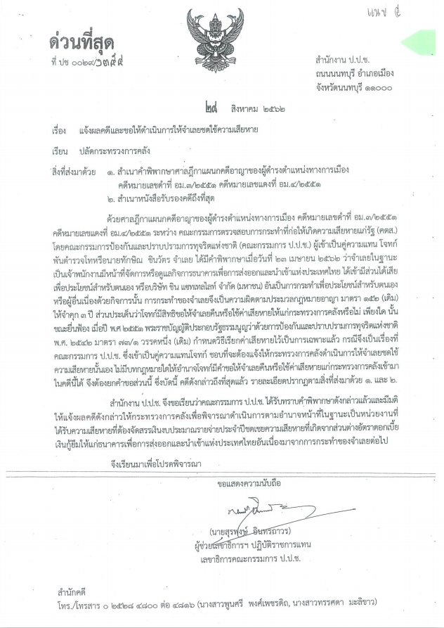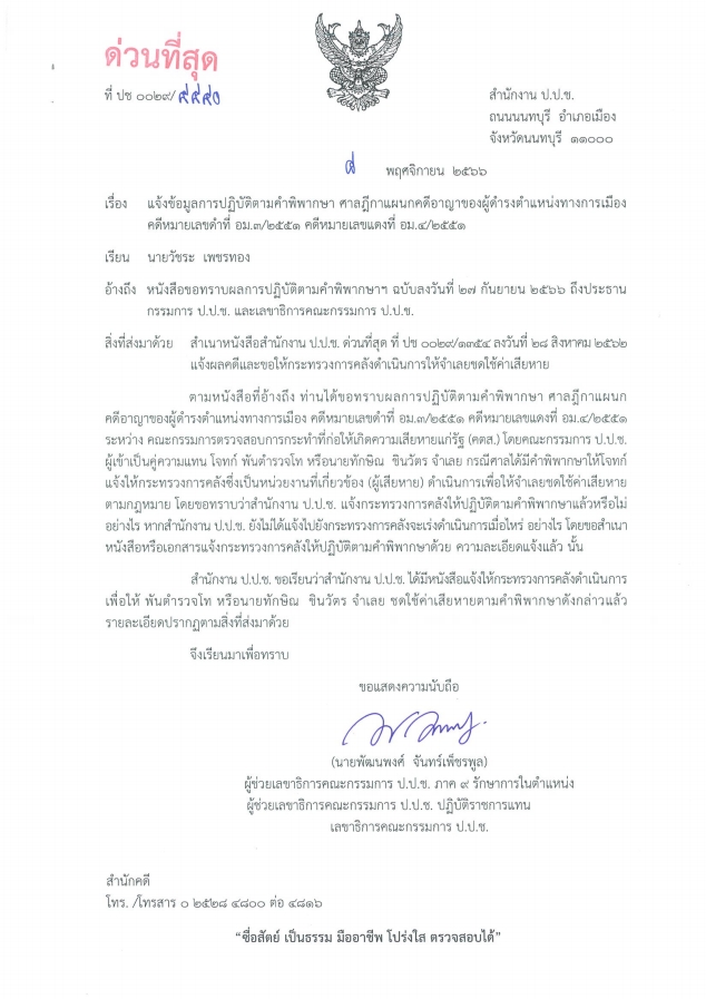 ต่อมานายพัฒนพงศ์ จันทร์เพ็ชรพูล ผู้ช่วยเลขาธิการคณะกรรมการ ป.ป.ช.ภาค 9 รักษาการในตำแหน่งผู้ช่วยเลขาธิการคณะกรรมการ ป.ป.ช. ปฏิบัติราชการแทนเลขาธิการคณะกรรมการ ป.ป.ช. ได้มีหนังสือด่วนที่สุด ลงวันที่ 8 พ.ย. 2566 ยืนยันต่อ นายวัชระ เพชรทอง ว่าสำนักงาน ป.ป.ช. (โจทก์) ได้มีหนังสือแจ้งให้กระทรวงการคลังดำเนินการเพื่อให้ พันตำรวจโท หรือ นายทักษิณ ชินวัตร (จำเลย) ชดให้ค่าเสียหายตามคำพิพากษา ศาลฎีกาแผนกคดีอาญาของผู้ดำรงตำแหน่งทางการเมือง คดีหมายเลขดำที่ อม.3/2551 คดีหมายเลขแดงที่ อม.4/2551 ไปแล้ว