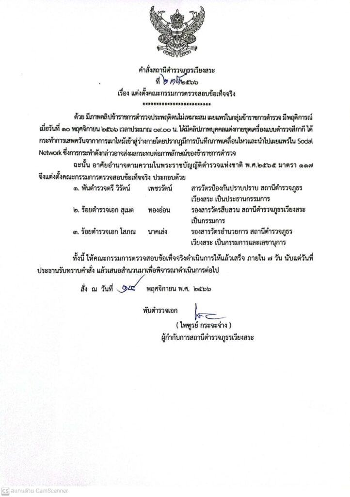 จากการตรวจสอบเบื้องต้นทราบว่า บุคคลที่ปรากฏตามภาพ คือ ร.ต.ท.สมเกียรติ งามประดิษฐ์ รอง สว.(ป.)ฯ ทำหน้าที่ พนักงานวิทยุสื่อสารประจำ สภ.เวียงสระ โดยปรากฏในสื่อ เมื่อเช้าวันนี้ 15 พ.ย.2566 เหตุการณ์ดังกล่าวถ่ายที่บ้านพัก เมื่อวันที่ 13 พ.ย.2566 เวลาประมาณ 09.00 น. โดยมีข้าราชการตำรวจรุ่นน้องเป็นผู้ถ่ายภาพ จากการตรวจสอบประวัติ ปรากฏว่าบุคคลในคลิปมีอาการป่วยเป็นโรคทางสุขภาพจิตและจิตเวช และมีใบรับรองการรักษาของ รพ.สวนสราญรมย์ สภ.เวียงสระ จึงได้ส่งตัว ร.ต.ท.สมเกียรติฯ ผู้ป่วยเข้ารับการตรวจร่างกายและบำบัดรักษาที่รพ.สวนสราญรมย์ พร้อมออกคำสั่งแต่งตั้งคณะกรรมการตรวจสอบข้อเท็จจริงและดำเนินการทางวินัยในกรณีดังกล่าวแล้ว