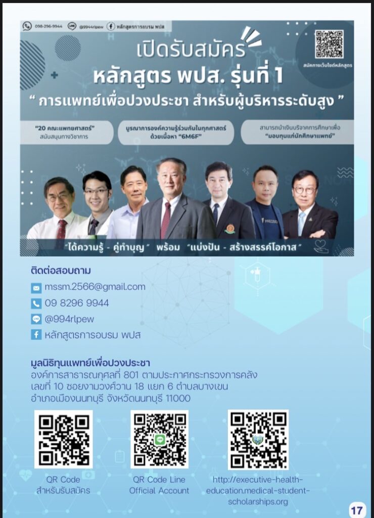 มูลนิธิทุนแพทย์เพื่อปวงประชา ได้เปิดตัวหลักสูตรการแพทย์เพื่อปวงประชา สำหรับผู้บริหารระดับสูง พปส.รุ่นที่ 1 ชวนผู้ที่สนใจดูแลสุขภาพ มาร่วมเป็นกำลังสำคัญในการแบ่งปันและสร้างโอกาสให้บุคลากรทางการแพทย์ โดยได้งานแถลงข่าวเปิดตัวหลักสูตรเมื่อวันที่ 15 พฤศจิกายน 2566 ที่ผ่านมา ณ โรงแรมชาเทรียม แกรนด์ กรุงเทพฯ