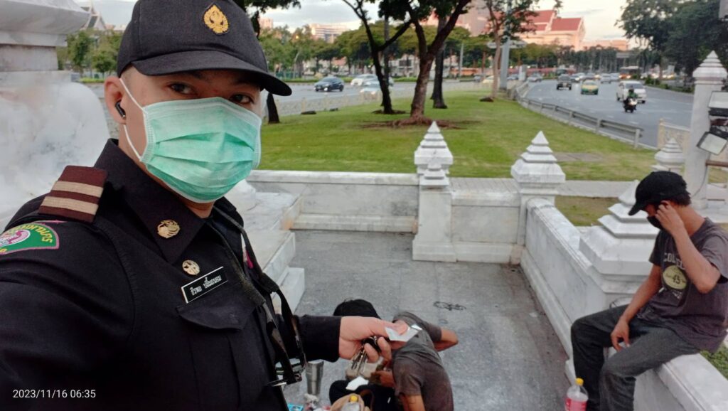 วันนี้ (16พ.ย.66) เวลา 06:31 น. นายโกศล สิงหนาท ผู้อำนวยการเขตพระนคร นายกฤษดา เพ็ชรสีสัง ผู้ช่วยผู้อำนวยการเขตพระนคร มอบหมาย นายณัฐชนนท์ ชญาน์ธนวิชญ์ หัวหน้าฝ่ายเทศกิจ นายศุภกฤต สูนโยธา เจ้าพนักงานงานเทศกิจชำนาญการ สั่งการให้ นายนิติ ยอดแคร่ว หัวหน้าชุดสายตรวจ จัดกำลัง เจ้าหน้าที่เทศกิจสายตรวจชุด 255 โดยมี นายธีรพล ปลื้มถนอม สายตรวจเทศกิจชุด 255 ลงพื้นที่ ตรวจสอบความเรียบร้อยกวดขันผู้ค้าและคนเร่ร่อน บริเวณอนุเสาวรีย์ช้างสี่เศียร ถนนราชดำเนินกลางขาเข้า เขตพระนคร กทม.