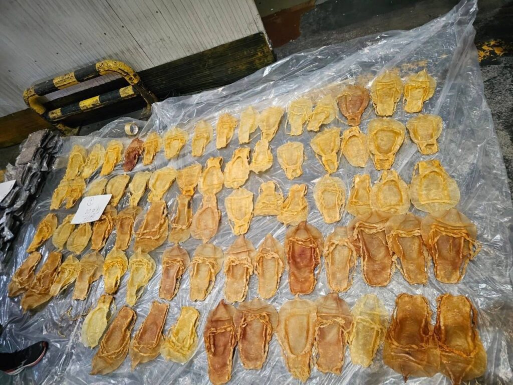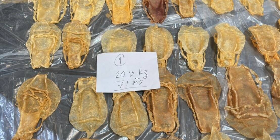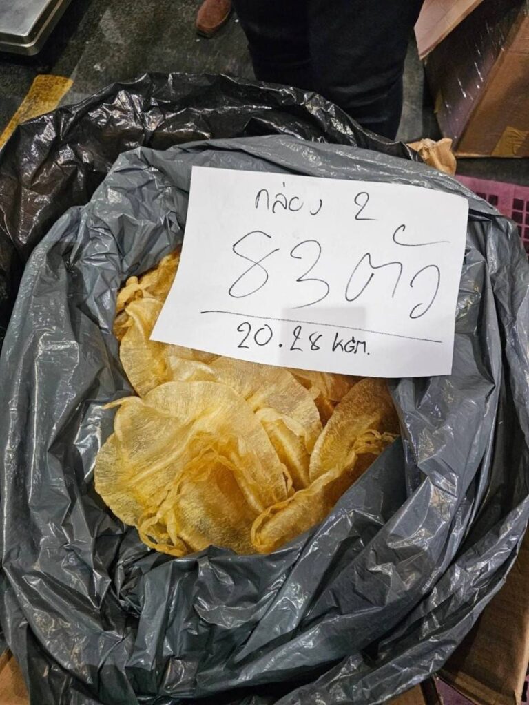 โดยเมื่อวันที่ 14 พฤศจิกายน 2566 สำนักงานศุลกากรตรวจสินค้าท่าอากาศยานสุวรรณภูมิ ได้ดำเนินการตรวจสอบใบขนสินค้าขาเข้า ต้นทางประเทศ Mexico สำแดงสินค้าเป็น Chocolate Chip (ช็อคโกแลตชิป) น้ำหนักสุทธิ 65 กิโลกรัม ต้องสงสัยว่ามีสิ่งผิดกฎหมายซุกซ่อนอยู่ ผลการตรวจสอบพบ Chocolate Chip (ช็อคโกแลตชิป) จำนวน 1 กล่อง น้ำหนัก 26.57 กิโลกรัม และกระเพาะปลาตากแห้ง จำนวน 2 กล่อง น้ำหนัก 40.38 กิโลกรัม เบื้องต้นไม่พบใบอนุญาตในการนำเข้า เจ้าหน้าที่จึงได้ทำการอายัดไว้ตรวจสอบและส่งกระเพาะปลาตากแห้งดังกล่าวไปให้ด่านตรวจประมงท่าอากาศยานสุวรรณภูมิ ได้ดำเนินการตรวจพิสูจน์ ชนิดพันธุ์ปลา ผลปรากฏว่า เป็นกระเพาะของปลา Totoaba macdonaldi (ปลาจวดแมคโดนัล) อยู่ภายใต้การควบคุมตามอนุสัญญาว่าด้วยการค้าระหว่างประเทศ ซึ่งชนิดสัตว์ป่าและพืชป่าที่ใกล้สูญพันธุ์