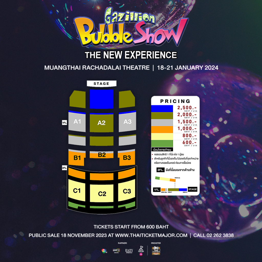 อย่าพลาดโอกาสแห่งความสนุกที่อาจพาคุณไปเป็นส่วนหนึ่งของสถิติโลกครั้งใหม่Gazillion Bubble Show เปิดการแสดงระหว่างวันที่ 18 – 21 มกราคม 2567 ที่ “เมืองไทยรัชดาลัย เธียเตอร์” บัตรราคาเริ่มต้น 600 บาท เปิดจำหน่ายบัตรวันเสาร์ที่ 18 พฤศจิกายนนี้ ทางเว็บไซต์ และเคาน์เตอร์ของ ไทยทิคเก็ตเมเจอร์ ทุกสาขา รายละเอียดเพิ่มเติมที่ thaiticketmajor.com