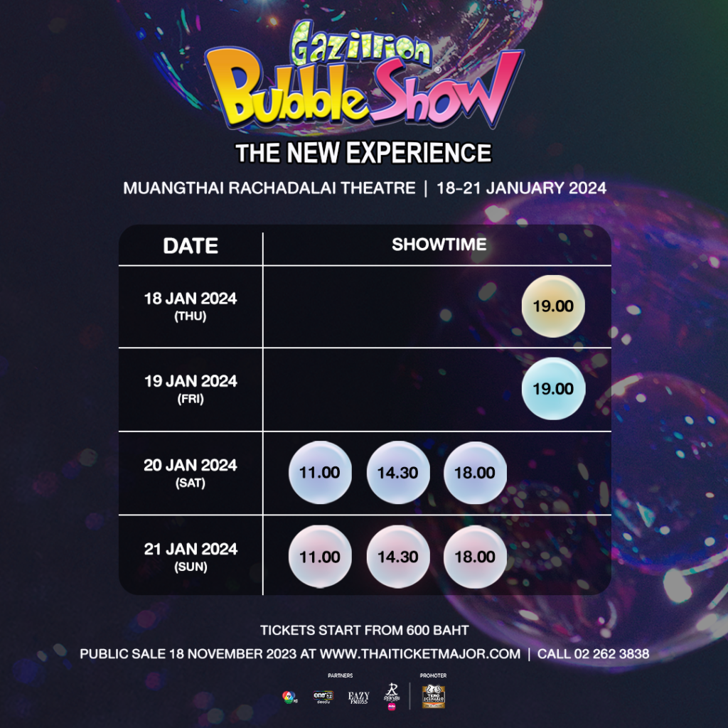 โชว์ฟองสบู่สุดหรรษา “Gazillion Bubble Show” กำลังจะกลับมาสร้างปรากฏการณ์ครั้งใหม่ให้กับคนไทย ในต้นปีหน้า ตั้งแต่วันที่ 18 – 21 มกราคม 2567 ที่ “เมืองไทยรัชดาลัย เธียเตอร์” เพียง 8 รอบการแสดงเท่านั้น!! เริ่มเปิดจำหน่ายบัตรวันที่ 18 พฤศจิกายนนี้ที่ thaiticketmajor.com