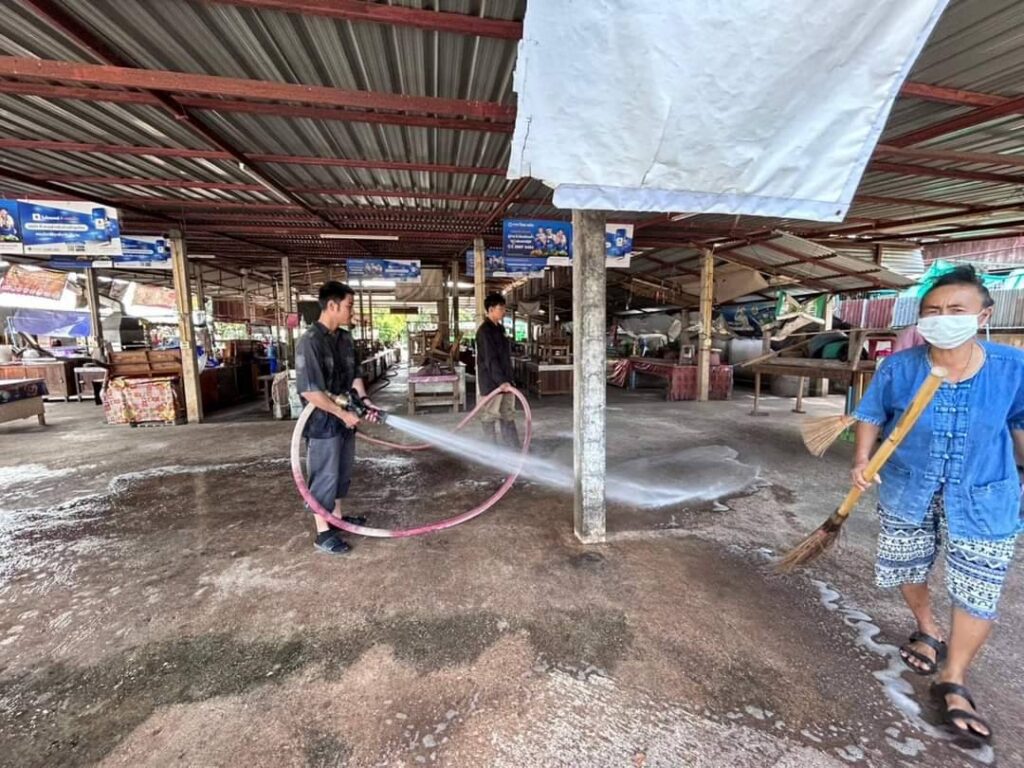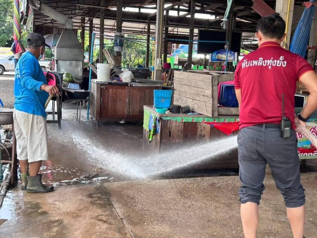 วันศุกร์ที่ 17 พฤศจิกายน 2566 เวลา 09.30 น. ท่านเขมชาติ มั่นเจ๊ก นายกเทศมนตรีตำบลทุ่งยั้ง ได้มอบหมายให้เจ้าหน้าที่กองสาธารณสุขและสิ่งแวดล้อม และเจ้าหน้าที่งานป้องกันภัยและบรรเทาสาธารณะภัยของเทศบาลตำบลทุ่งยั้ง ลงพื้นที่ดำเนินการล้างตลาด เพื่อทำความสะอาดพื้นผิว ภาชนะ และบริเวณที่มีการสัมผัสบ่อยครั้ง ณ ตลาดอุไรวรณ์ (ตลาดสดโก๊ะตี๋) ภายในชุมชนบ้านไผ่เขียว หมู่ที่ 2 ตำบลไผ่ล้อม เพื่อเป็นการเฝ้าระวังและป้องกันการแพร่กระจายโรคเลปโตสไปโรสิสที่กำลังแพร่ระบาดในปัจจุบัน และเพื่อสร้างความเชื่อมั่นให้กับพ่อค้า แม่ค้า ตลอดจนผู้ซื้อสินค้า กับการเฝ้าระวังสุขลักษณะของตลาดสด ทำให้ตลาดมีความสะอาด ปลอดภัยต่อผู้บริโภค