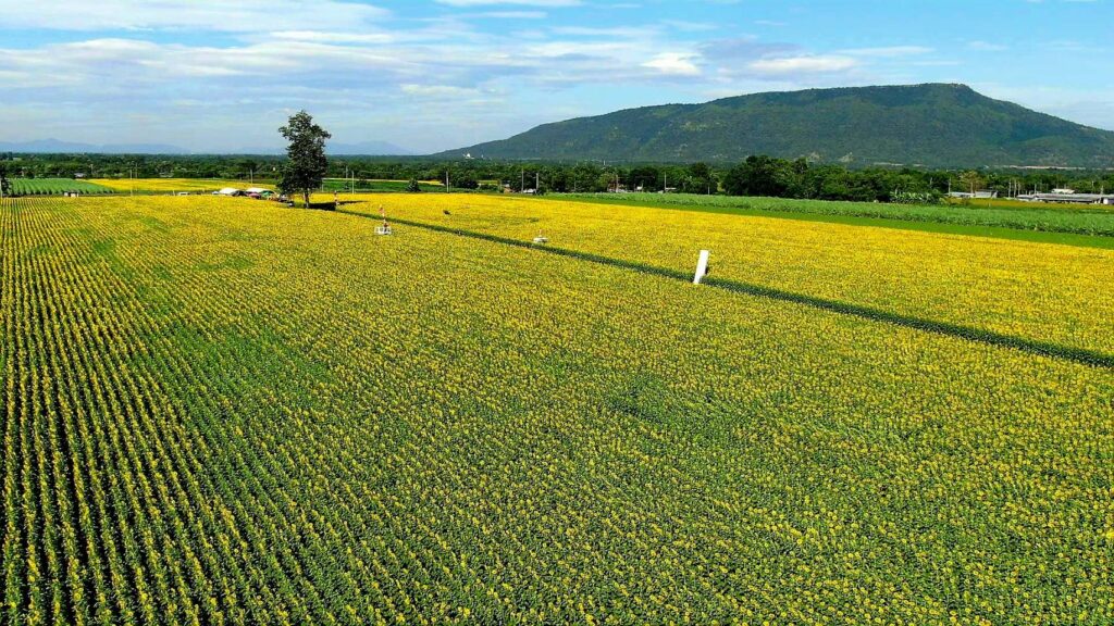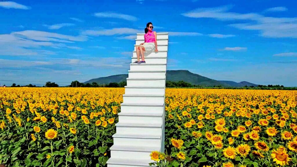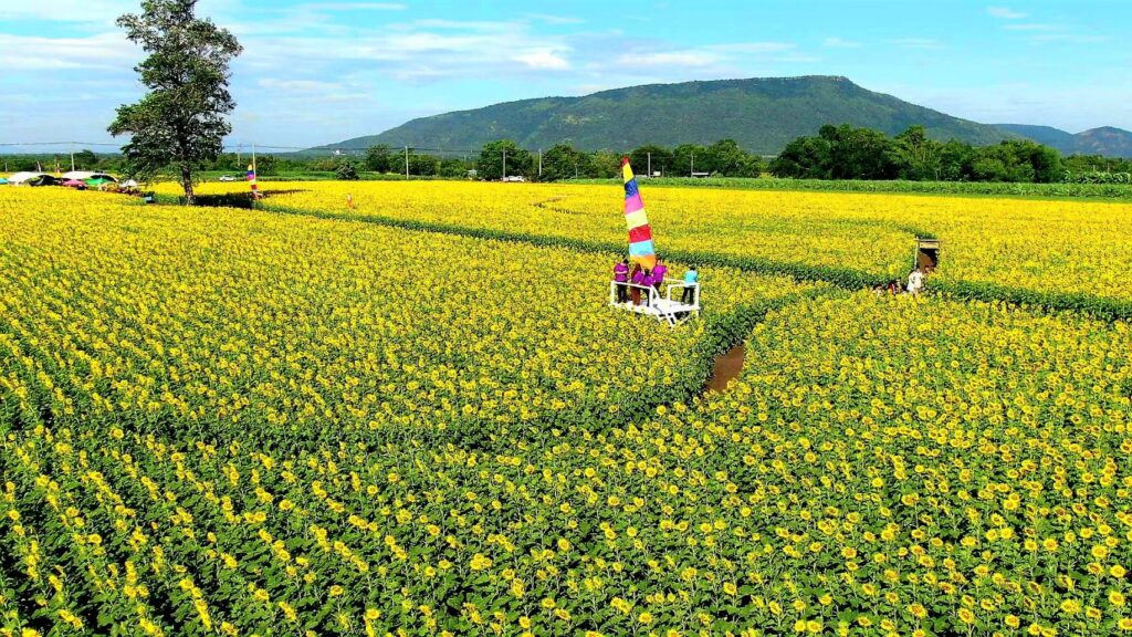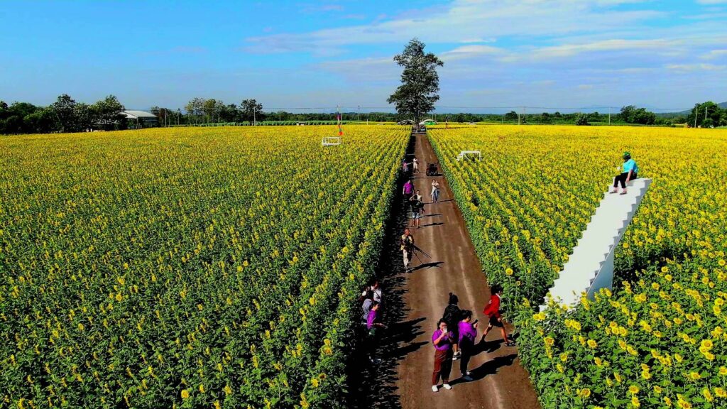 ทุ่งทานตะวัน แห่งนี้ เป็นทุ่งทานตะวันแปลงใหญ่ ซึ่งกำลังเบ่งบานสะพรั่ง 100 เปอร์เซ็นต์ บนเนื้อที่ กว่า 75 ไร่ ของนายรำยอง รื่นสนธิ์ ซึ่งมีพื้นที่เพาะปลูกอยู่ใน ตำบลมะนาวหวาน อำเภอพัฒนานิคม จังหวัดลพบุรี กำลังบานสะพรั่งรับลมหนาว สอดรับกับฤดูการท่องเที่ยว ในรูปแบบเกษตรกร Smart farmer และถือเป็นหนึ่งใน 5 ซอฟต์พาวเวอร์ ของจังหวัดลพบุรี ซึ่งเป็นการปลูกทานตะวัน ตามที่กระทรวงเกษตรและสหกรณ์ โดยกรมส่งเสริมการเกษตร สำนักงานเกษตรจังหวัดลพบุรี รวมถึง การท่องเที่ยวแห่งประเทศไทย ได้เข้าไปส่งเสริมและพัฒนายกระดับ ให้เป็นผู้ประกอบการเกษตร ด้านการให้บริการ เป็นแหล่งท่องเที่ยวเชิงเกษตรของจังหวัดลพบุรี เชื่อมโยงกับการท่องเที่ยว “รถไฟลอยน้ำ” ของการรถไฟแห่งประเทศไทย ซึ่งใช้การเพาะปลูกด้วยการหยอดเมล็ด และเมื่อต้นทานตะวันโตเต็มที่ออกดอกเบ่งบานสวยงามอย่างที่เห็น ก็จะเปิดให้นักท่องเที่ยวเข้าชม พร้อมกับ จัดพร็อพเก๋ๆ เป็นมุมต่างๆ ไว้ให้นักท่องเที่ยวได้ถ่ายรูป และจะมีบันไดสูง สำหรับให้นักท่องเที่ยวขึ้นไปชมทุ่งและเก็บภาพในมุมสูง ก็จะเห็นความโดดเด่นสวยงามที่สุดลูกหู ลูกตา โดยมีรถไถเพื่อการเกษตร และ รถเอทีวี แบบ 4 ล้อ คอยให้บริการแก่นักท่องเที่ยว โดยด้านหลังของทุ่งทานตะวันแปลงนี้ จะมีฉากหลังเป็นภูเขาสูงที่ชาวบ้านเรียกกันว่า “เขาพระยาเดินธง” ตัดกับท้องฟ้าสีครามโดยจุดเด่นของทุ่งทานตะวันแปลงใหญ่แห่งนี้ จะมีการเปิดช่องทางเดิน ผ่ากลางทุ่งกว่าประมาณ 3 เมตร และมีความยาวเกือบ 500 เมตร ไปจนถึงท้ายทุ่ง เพื่อให้นักท่องเที่ยวได้เดินเลือกถ่ายภาพ เซลฟี่ กับมุมถ่ายภาพสวยๆ กันได้อย่างสะดวกสบาย ไม่ต้องเบียดเสียดแย่งกัน