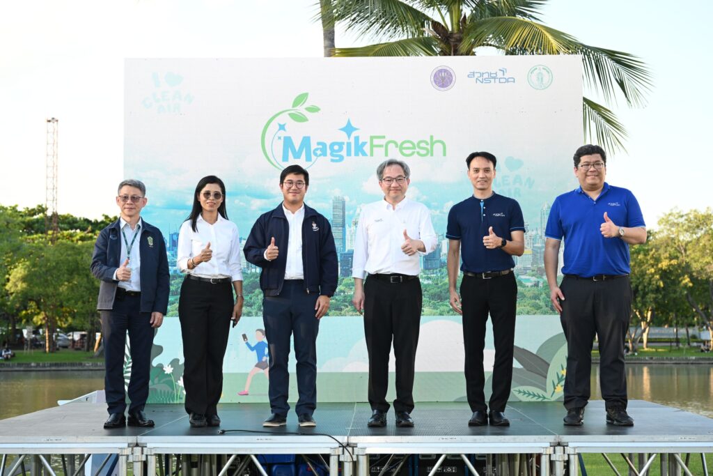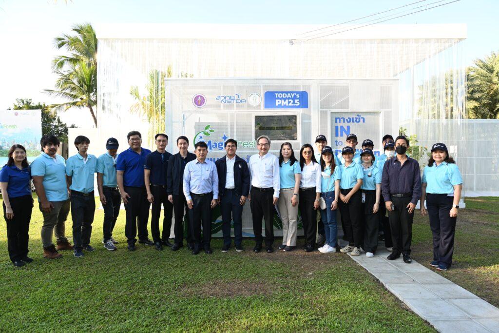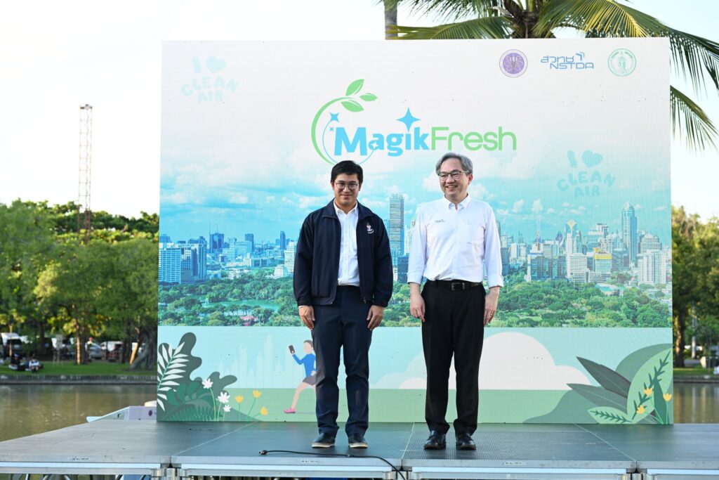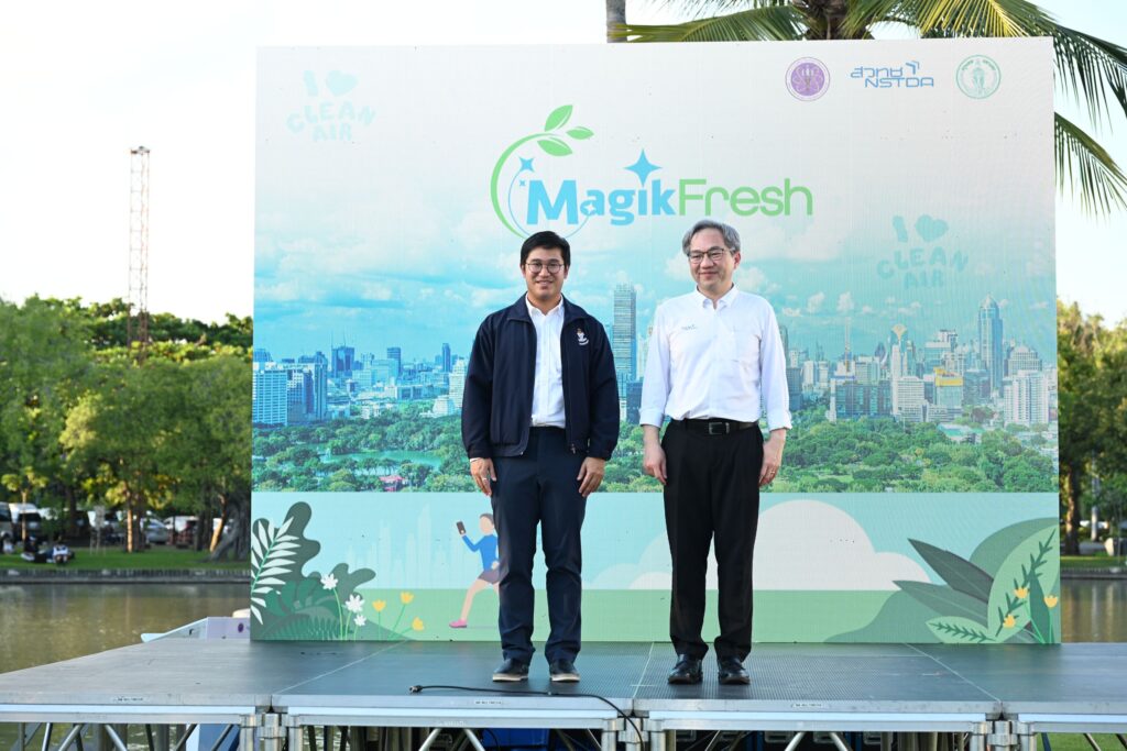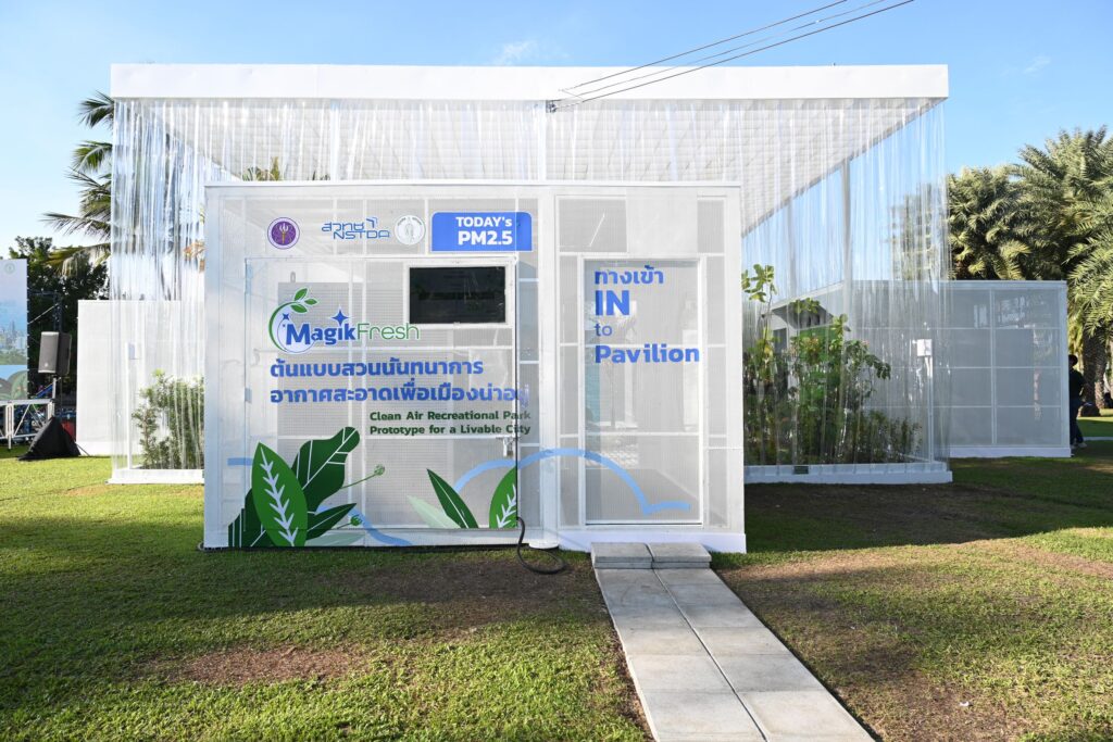 เมื่อวันที่ 24 พฤศจิกายน 2566 ที่อุทยานสวนจตุจักร กรุงเทพฯ : ศาสตราจารย์ ดร.ชูกิจ ลิมปิจำนงค์ ผู้อำนวยการสำนักงานพัฒนาวิทยาศาสตร์และเทคโนโลยีแห่งชาติ (สวทช.) พร้อมด้วย นายพรพรหม ณ.ส.วิกิตเศรษฐ์ ที่ปรึกษาของผู้ว่าราชการกรุงเทพมหานคร ร่วมแถลงข่าวเปิดตัว “ต้นแบบสวนนันทนาการอากาศสะอาดเพื่อเมืองน่าอยู่” หรือ “MagikFresh” ซึ่งเป็นนวัตกรรมที่ช่วยลดปัญหาฝุ่นละอองขนาดเล็ก PM2.5 ด้วยการออกแบบโครงสร้างกึ่งเปิดขนาดย่อมบนพื้นที่ 100 ตารางเมตร พร้อมติดตั้งเครื่องกรองฝุ่น PM2.5 เพื่อให้ประชาชนสามารถเข้าไปใช้ประโยชน์ทำกิจกรรมนันทนาการและพักผ่อนหย่อนใจ ซึ่งภายในจะมีอากาศสะอาดและช่วยลดฝุ่น PM2.5 จากภายนอกได้ โดยความร่วมมือกับสำนักสิ่งแวดล้อม กรุงเทพมหานคร ที่ได้ให้การสนับสนุนพื้นที่บริเวณอุทยานสวนจตุจักร เพื่อติดตั้งและทดสอบการใช้งาน ภายใต้บันทึกข้อตกลงความร่วมมือด้านการวิจัยและพัฒนาระหว่างกรุงเทพมหานคร และ (สวทช.)