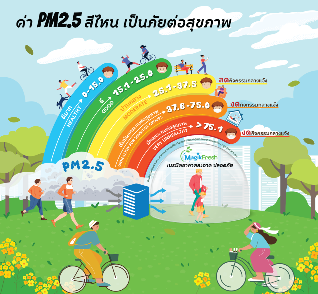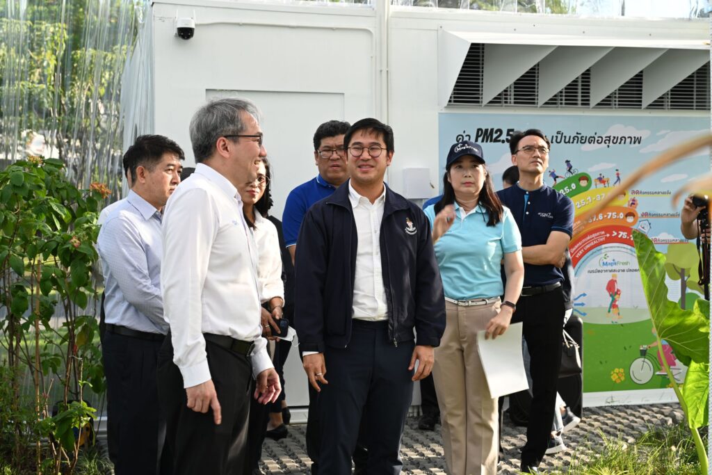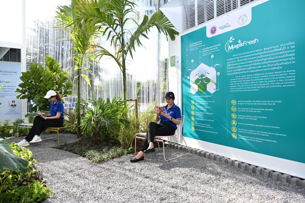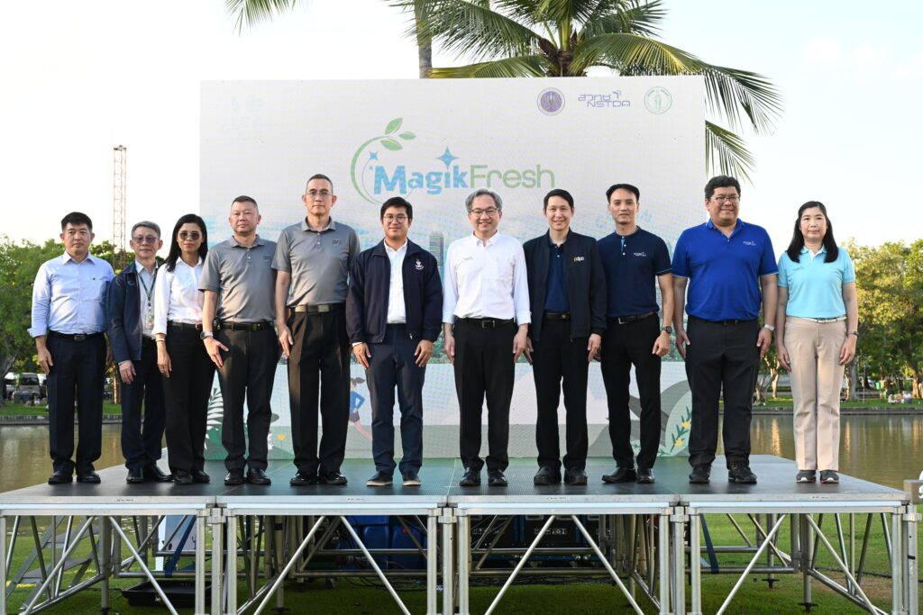 เมื่อวันที่ 24 พฤศจิกายน 2566 ที่อุทยานสวนจตุจักร กรุงเทพฯ : ศาสตราจารย์ ดร.ชูกิจ ลิมปิจำนงค์ ผู้อำนวยการสำนักงานพัฒนาวิทยาศาสตร์และเทคโนโลยีแห่งชาติ (สวทช.) พร้อมด้วย นายพรพรหม ณ.ส.วิกิตเศรษฐ์ ที่ปรึกษาของผู้ว่าราชการกรุงเทพมหานคร ร่วมแถลงข่าวเปิดตัว “ต้นแบบสวนนันทนาการอากาศสะอาดเพื่อเมืองน่าอยู่” หรือ “MagikFresh” ซึ่งเป็นนวัตกรรมที่ช่วยลดปัญหาฝุ่นละอองขนาดเล็ก PM2.5 ด้วยการออกแบบโครงสร้างกึ่งเปิดขนาดย่อมบนพื้นที่ 100 ตารางเมตร พร้อมติดตั้งเครื่องกรองฝุ่น PM2.5 เพื่อให้ประชาชนสามารถเข้าไปใช้ประโยชน์ทำกิจกรรมนันทนาการและพักผ่อนหย่อนใจ ซึ่งภายในจะมีอากาศสะอาดและช่วยลดฝุ่น PM2.5 จากภายนอกได้ โดยความร่วมมือกับสำนักสิ่งแวดล้อม กรุงเทพมหานคร ที่ได้ให้การสนับสนุนพื้นที่บริเวณอุทยานสวนจตุจักร เพื่อติดตั้งและทดสอบการใช้งาน ภายใต้บันทึกข้อตกลงความร่วมมือด้านการวิจัยและพัฒนาระหว่างกรุงเทพมหานคร และ (สวทช.)