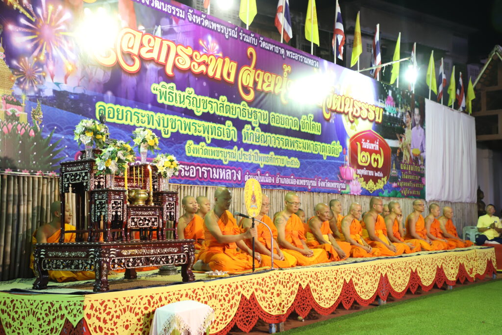 โอกาสนี้ พระราชพัชรธรรมเมธี เจ้าคณะจังหวัดเพชรบูรณ์ (ม) แสดงธรรมในเรื่อง “พระพุทธเจ้ามหาบุรุษ” หลังจากนั้น เจ้าคณะจังหวัดเพชรบูรณ์ ในฐานะประธานฝ่ายสงฆ์ พร้อมคณะสงฆ์ ทำพิธีชักโคมโดยเข้าประจำโคมด้านทิศตะวันออกเฉียงเหนือ และตะวันตกเฉียงเหนือ ส่วนประธานฝ่ายฆราวาส รองผู้ว่าราชการจังหวัดเพชรบูรณ์ หัวหน้าส่วนราชการ เข้าประจำโคมด้านตะวันออกเฉียงใต้ และตะวันตกเฉียงใต้ จากนั้นลอยถาดดอกไม้เครื่องหอมบูชาพระพุทธเจ้า ในเนรัญชราจำลอง ประชาชนผู้มาร่วมงานรับของมงคลจากเรือทาน ซึ่งการจัดงานลอยกระทง ณ บริเวณแม่น้ำเนรัญชราจำลอง ที่วัดมหาธาตุ พระอารามหลวง ในครั้งนี้ประชาชนได้ทยอยเดินทางมาร่วมลอยกระทง จนถึงเวลา 22.00 น.