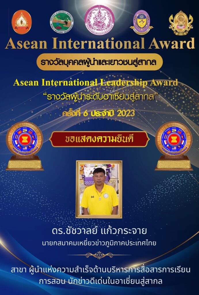 - ดร.ชัชวาลย์ แก้วกระจาย นายกสมาคมเหยี่ยวข่าวภูมิภาคประเทศไทย รับ 2 รางวัล รางวัลพระภัทรภักดิ์ และ รางวัล Asean International Awards 2023