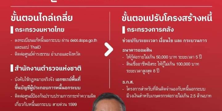 - ประชาชนที่ประสบปัญหาหรือต้องการเปลี่ยนหนี้นอกระบบเป็นในระบบ เพื่อจะได้มีภาระในการผ่อนชำระน้อยลง สามารถลงทะเบียนที่ ศูนย์ดำรงธรรม ณ ศาลากลางและที่ว่าการอำเภอ หรือสำนักงานเขตทุกแห่ง