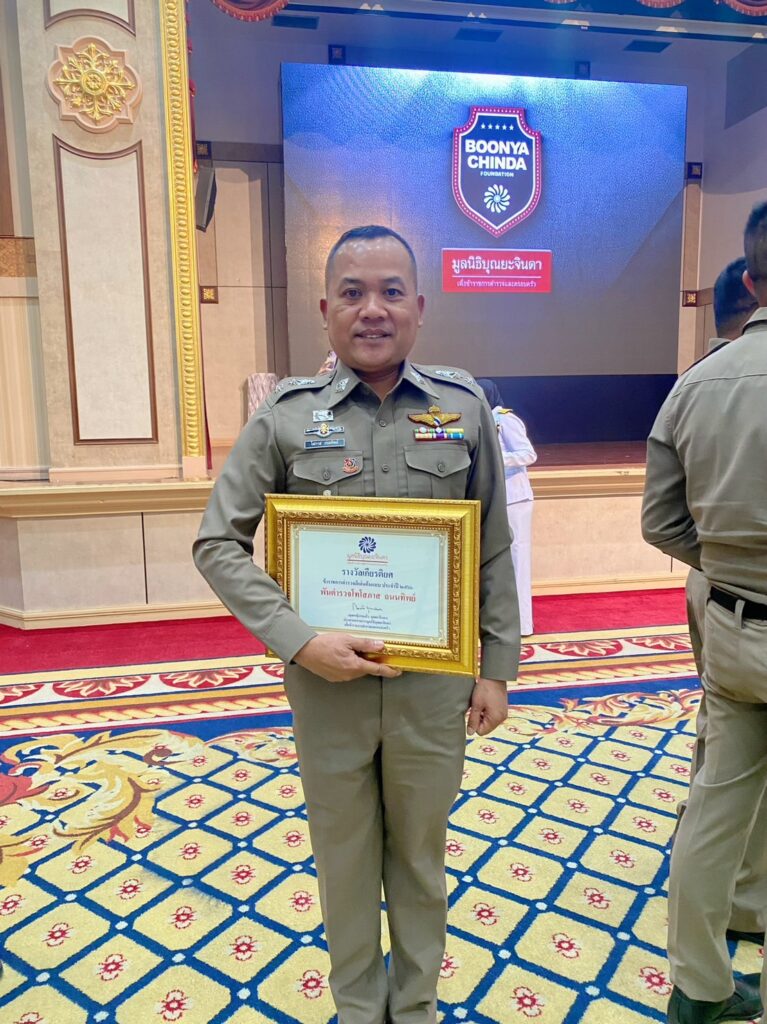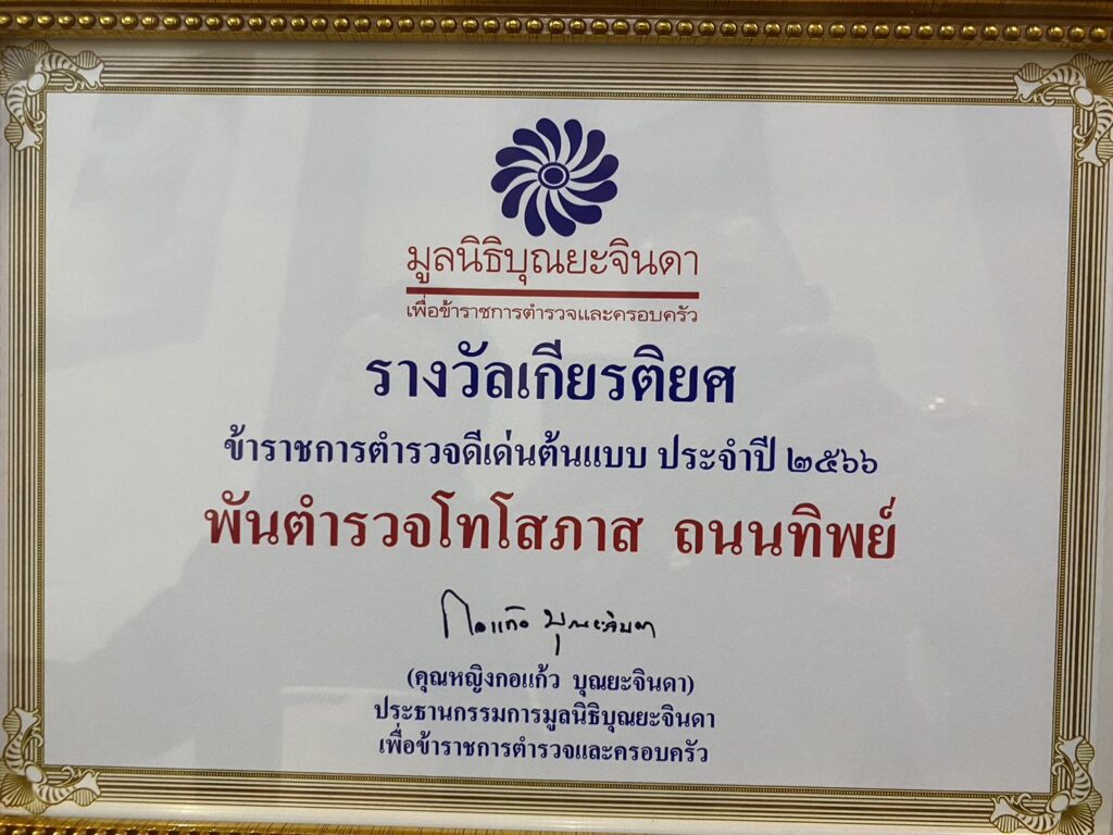 เมื่อวันที่ 29 พฤศจิกายน 266 ที่สำนักงานตำรวจแห่งชาติ พล.ต.อ.ต่อศักดิ์ สุขวิมล ผบ.ตร. พร้อมด้วย คุณหญิงกอแก้ว บุณยะจินดา ประธานกรรมการมูลนิธิบุณยะจินดา เพื่อข้าราชการตำรวจและครอบครัว เป็นประธาน มอบรางวัลเกียรติยศ ข้าราชการตำรวจดีเด่นต้นแบบ ประจำปี 2566 แก่ พ.ต.ท.โสภาส ถนนทิพย์ สารวัตป้องกันและปราบปราม สภ.เมืองสมุทรสาคร โดยในปีนี้มีข้าราชการตำรวจและพลเมืองดีเข้ารับรางวัลประเภทต่างๆ จำนวน 6 กลุ่ม รวมทั้งสิ้น 25 นาย รางวัลประเภทประกาศเกียรติบัตร พร้อมเงินทุนสนับสนุน 10,000บาท เป็นข้าราชการตำรวจ จำนวน 16 รางวัล ได้แก่ด้านป้องกันและปราบปรามอาชญากรรมดีเด่น ประกอบด้วย 1.พ.ต.อ.พันษา อมราพิทักษ์ ผกก.สน.ทองหล่อ บก.น.5 บชน.