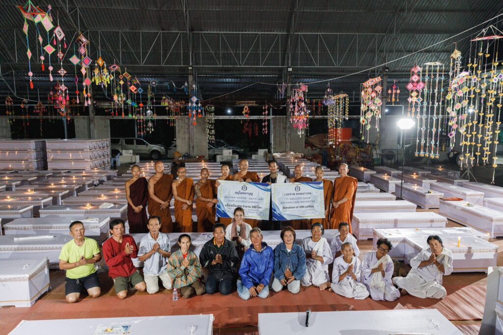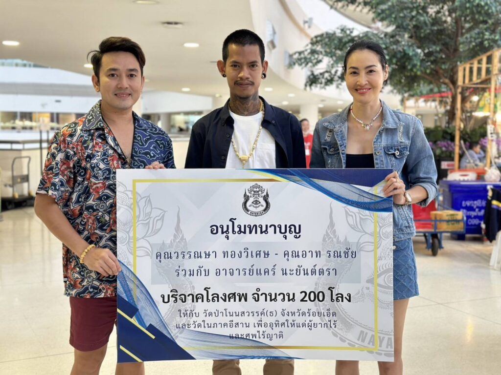 ด้าน อาจารย์แคร์ นะยันต์ตรา ก็เผยว่า “เป็นความตั้งใจของผมและครอบครัวที่จะสร้างบุญในการบริจาคโลงศพครับ เพราะ ท่านเจ้าอาวาส วัดป่าโนนสวรรค์ (ธ) จังหวัดร้อยเอ็ด ท่านมีโครงการบริจาคโลงศพแก่ผู้ยากไร้และผู้ประสบภัย ทางสำนักสักยันต์นะยันต์ตราและลูกศิษย์ทั้งชาวไทยและต่างประเทศได้ทราบข่าว จึงขอเป็นเจ้าภาพถวายโลงศพทั้งหมด 200โลง ให้กับทางวัดเพื่อกระจายไปให้ภาคส่วนต่างๆ ทางภาคอีสานด้วยครับ ถ้าวัดไหนหรือมูลนิธิกู้ภัยต่างๆ ต้องการโลงศพให้กับผู้เสียชีวิต หรือศพไร้ญาติก็มารับได้ที่วัดป่าโนนสวรรค์ (ธ) ซึ่งจะเป็นส่วนกลางที่จะแจกจ่ายให้ครับ โดยทางวัดก็ได้มีการทำพิธีสวดมนต์เพื่ออุทิศให้กับผู้ยากไร้ และศพไร้ญาติด้วยครับ”