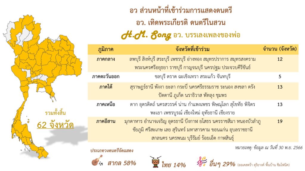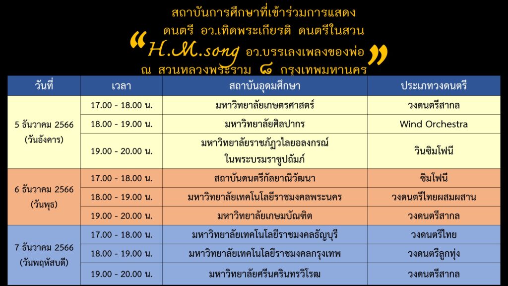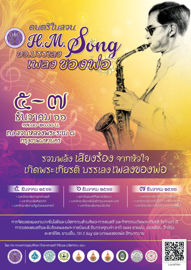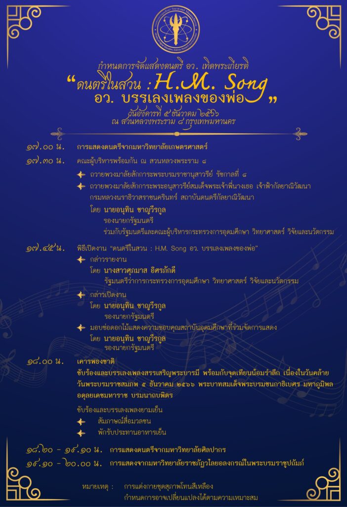 เมื่อวันที่ 1 ธันวาคม 2566 : น.ส.ศุภมาส อิศรภักดี รมว.การอุดมศึกษาวิทยาศาสตร์ วิจัยและนวัตกรรม (อว.) เปิดเผยว่า (อว.) จะจัดการแสดงดนตรีในสวน : H.M. Song อว.บรรเลงเพลงของพ่อพร้อมกันทั่วประเทศ เพื่อเทิดพระเกียรติพระบาทสมเด็จพระบรมชนกาธิเบศร มหาภูมิพลอดุลยเดชมหาราช บรมนาถบพิตร และเพื่อแสดงออกซึ่งความจงรักภักดีและน้อมรำลึกในพระมหากรุณาธิคุณ เนื่องในวันคล้ายวันพระบรมราชสมภพ 5 ธันวาคม 2566 โดยกิจกรรมภายในงาน จะมีการแสดงดนตรี H.M.song อว.บรรเลงเพลงของพ่อ ในรูปแบบวงดนตรีไทย ดนตรีสากล ซิมโฟนี ออร์เคสตรา วงดุริยางค์ วงโยธวาทิต วงดนตรีโฟล์คซอง การแสดงนาฏศิลป์ท้องถิ่นเทิดไท้สมเด็จบุรพกษัตริย์ไทย การขับร้อง และการแสดงนาฏยลีลาร่วมสมัย การเทิดพระเกียรติในหลวงรัชกาลที่ 9 โดยร่วมขับร้องเพลงเพลงสรรเสริญพระบารมี พร้อมกับจุดเทียนน้อมรำลึก เนื่องในวันคล้ายวันพระบรมราชสมภพฯ และการแสดงนิทรรศการเทิดพระเกียรติ ในหลวงรัชกาลที่ 9 เช่น เอกองค์อัครศิลปินการดนตรี เศรษฐกิจพอเพียง โดยในปีนี้ มีการจัดงานฯ จำนวนมากกว่า 62 จังหวัดครอบคลุมทั่วประเทศ มีสถาบันการศึกษา และมีหน่วยงานในสังกัดอื่นเข้าร่วม เช่น โรงเรียน หน่วยงานในจังหวัด องค์กรปกครองส่วนท้องถิ่น มณฑลทหารบก การท่องเที่ยวแห่งประเทศไทย และส่วนราชการอื่น ๆ ในพื้นที่มากกว่า 75 องค์กร