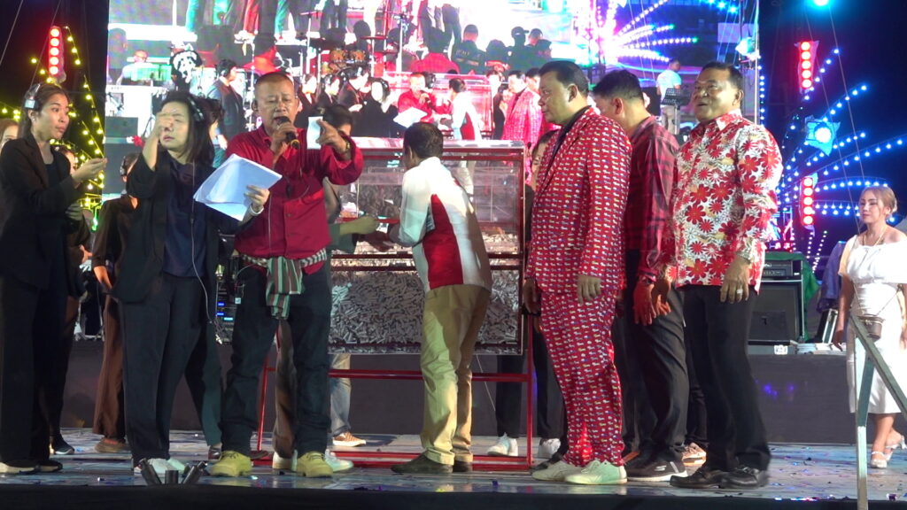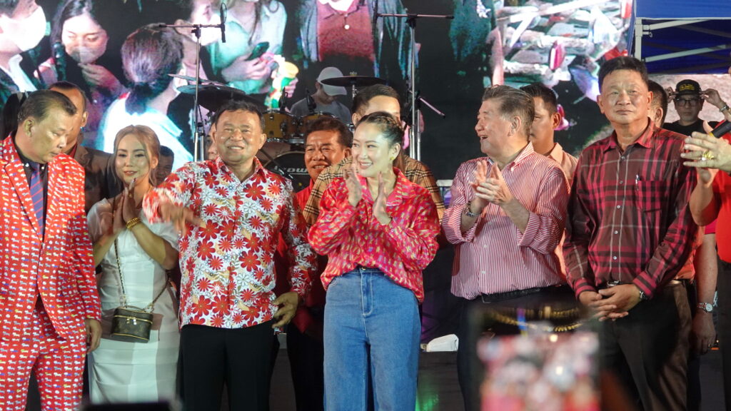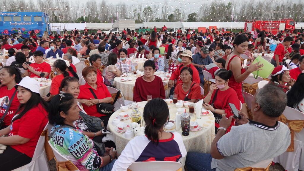 บรรยากาศภายในงานได้มีการเตรียมโต๊ะจีน 3,000 โต๊ะ มีของแจกมากมาย พร้อมการจับฉลากแจกรถจักรยานยนต์ 30คัน ตู้เย็น 100 ตู้ ทองคำสองสลึง 20 รางวัลเงินสด 5000 บาท จำนวน 10 รางวัล โดยประชาชนเสื้อแดงปทุมานีได้รอต้อนรับ นางสาวแพทองธาร ชินวัตร (อุ๊งอิ๊ง) หัวหน้าพรรคเพื่อไทย พร้อมคณะทีมงานพรรคเพื่อไทย และมอบดอกกุหลาบจากนั้นขึ้นเวทีกล่าวอวยพรงานเลี้ยงขึ้นบ้านใหม่ โดยมีสุรพงษ์ อึ้งอัมพรวิไล ที่ปรึกษารัฐมนตรีช่วยว่าการกระทรวงคมนาคม ,นายศุภชัย นพขำ ดำรงตำแหน่งผู้ช่วยเลขานุการรัฐมนตรีว่าการ กระทรวงมหาดไทย ร่วมแสดงความยินดี และ นายชาญ พวงเพ็ชร์ อดีตนายกองค์การบริหารส่วนจังหวัดปทุมธานี และผู้นำท้องถิ่นร่วมขึ้นเวทีจับรางวัลให้โชคกับผู้ที่มาร่วมงานเลี้ยง โดยโฆษกบนเวทีพูดเชียร์ว่าหากได้ลงชิงตำแหน่งนายก อบจ.ในสมัยหน้าต้องได้