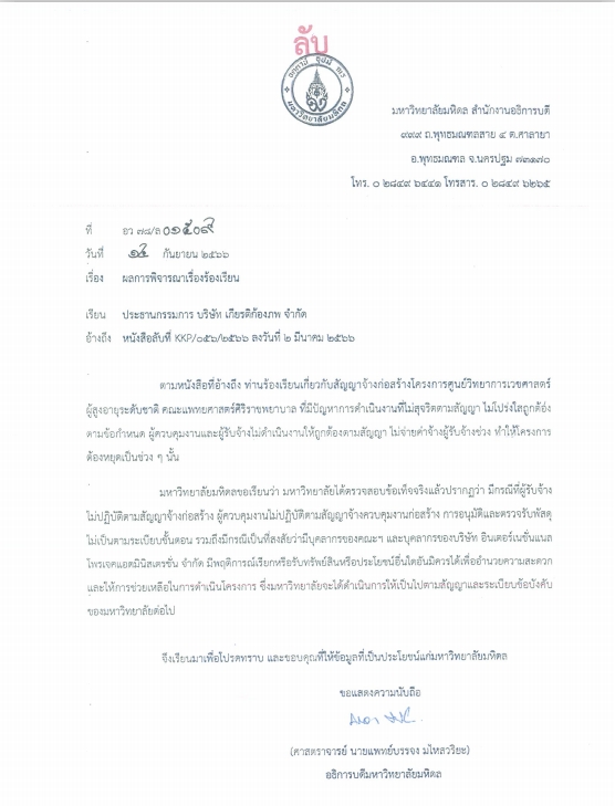 จากกรณีเมื่อวันที่ 14 กันยายน 2566 ศาสตราจารย์ นายแพทย์บรรจง มไหสวริยะ อธิการบดีมหาวิทยามหิดล มีหนังสือตอบรับต่อ ประธานกรรมการบริษัท เกียรติก้องภพ จำกัด แจ้งผลการพิจารณาเรื่องร้องเรียนเกี่ยวกับสัญญาจ้างก่อสร้างโครงการก่อสร้างอาคารศูนย์วิทยาการเวชศาสตร์ผู้สูงอายุระดับชาติ คณะแพทยศาสตร์ ศิริราชพยาบาล มหาวิทยาลัยมหิดล ที่มีปัญหาการดำเนินงานที่ไม่สุจริตตามสัญญา ไม่โปรงใสถูกต้อง ตามข้อกำหนดผู้ควบคุมงานและผู้รับจ้างไม่ดำเนินงานให้ถูกต้องตามสัญญา ไม่จ่ายค่าจ้างผู้รับจ้างช่วง ทำให้โครงการต้องหยุดเป็นช่วงๆ นั้น