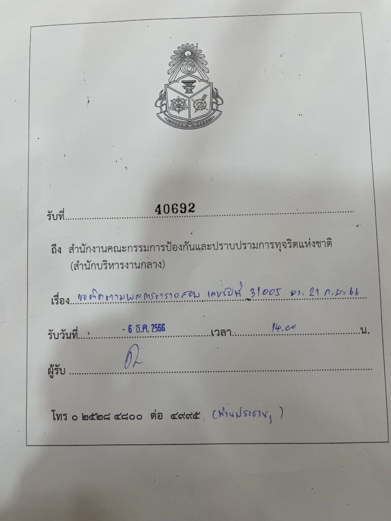 ต่อมาวันที่ 6 ธันวาคม 2566 นายวัชระ เพชรทอง อดีต สส.พรรคประชาธิปัตย์ เดินทางไปที่ สำนักงานคณะกรรมการป้องกันและปราบปรามการทุจริตแห่งชาติ ถ.นนทบุรี ต.ท่าทราย อ.เมืองนนทบุรี จ.นนทบุรี เพื่อยื่นหนังสือร้องเรียน ต่อ พลตำรวจเอกวัชรพล ประสานราชกิจ ประธานกรรมการ ป.ป.ช. และ นายนิวัติไชย เกษมมงคล เลขาธิการคณะกรรมการ ป.ป.ช. ผ่าน นายธนิต สุวรรณกาศ นักสืบสวนคดีทุจริตชำนาญการพิเศษ สำนักสืบสวนคดีทุจริต เพื่อขอติดตามผลการตรวจสอบการส่อทุจริตในการปฏิบัติหน้าที่ของคณะกรรมการตรวจรับพัสดุและผู้ควบคุมงาน โครงการก่อสร้างดังกล่าว กับพวกและขอให้ดำเนินการสอบสวนลงโทษตามกฎหมายของ ป.ป.ช.