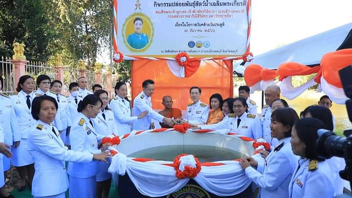 จากนั้น ผู้ว่าราชการจังหวัดลพบุรี ประธาน ในพิธี พร้อมด้วย นางสุวจี ศิริปัญโญ นายกเหล่ากาชาดจังหวัดลพบุรี นำข้าราชการตุลาการ ทหาร ตำรวจ ข้าราชการพลเรือน พร้อมด้วยพสกนิกรทุกหมู่เหล่า ร่วมประกอบพิธีทำบุญตักบาตรข้าวสารอาหารแห้งพระสงฆ์และสามเณร จำนวน 46 รูป และร่วมพิธีปล่อยพันธุ์สัตว์น้ำเฉลิมพระเกียรติและถวายเป็นพระราชกุศล จำนวน 46,999 ตัว ณ บริเวณท่าน้ำวัดสิงห์ทอง เพื่อส่งเสริมให้พสกนิกรทุกหมู่เหล่ารวมกันทำความดีถวายเป็นพระราชกุศล แสดงออกถึงความจงรักภักดีต่อสถาบันพระมหากษัตริย์ นำหลักคำสอนทางศาสนามาใช้ในการดำเนินชีวิต สืบสานวัฒนธรรมอันเกี่ยวเนื่องกับสถาบันหลักของชาติและเสริมสร้างความรักความสามัคคีของประชาชน