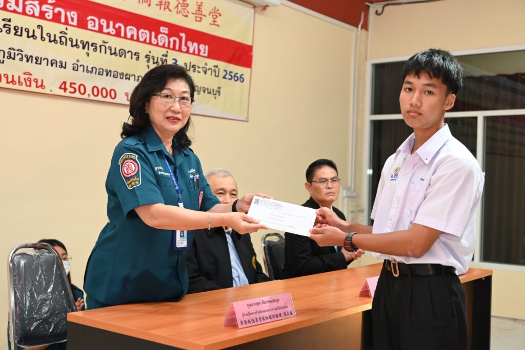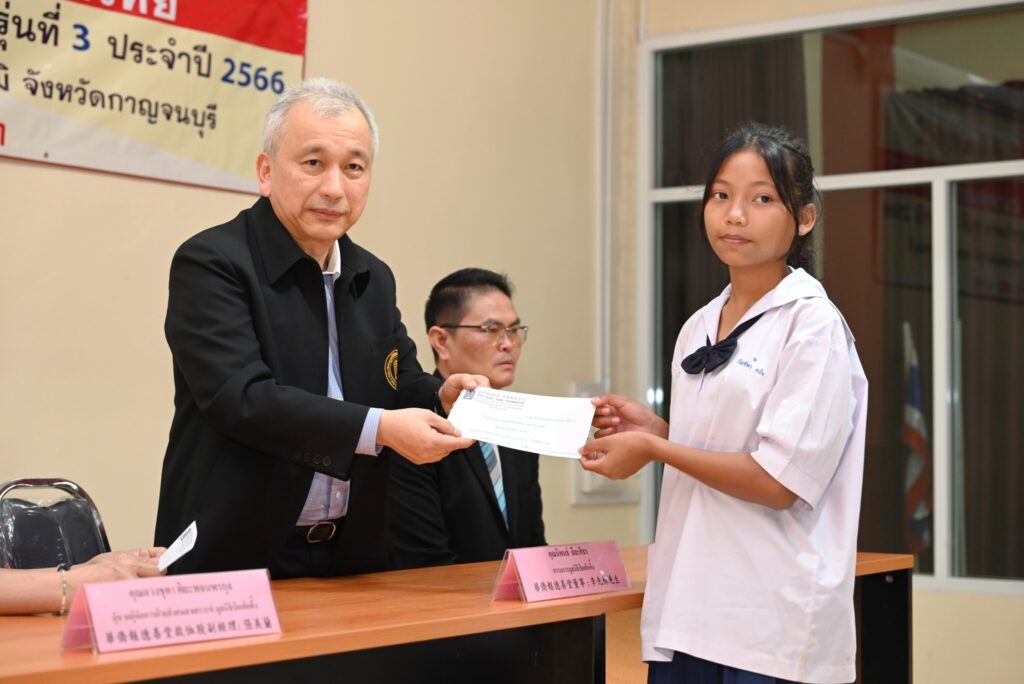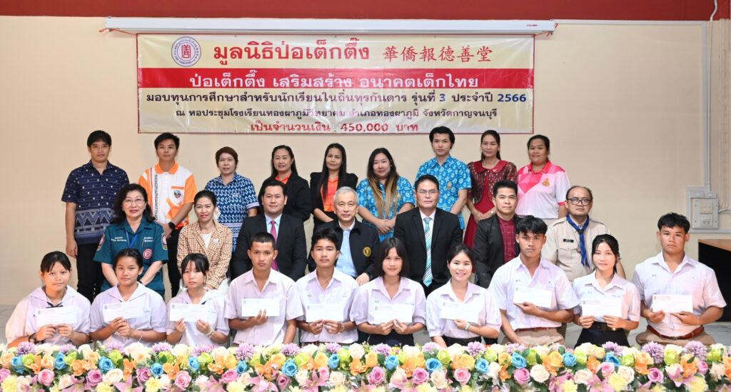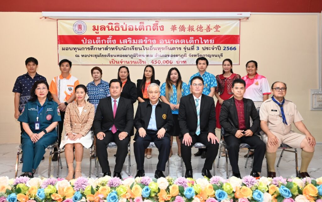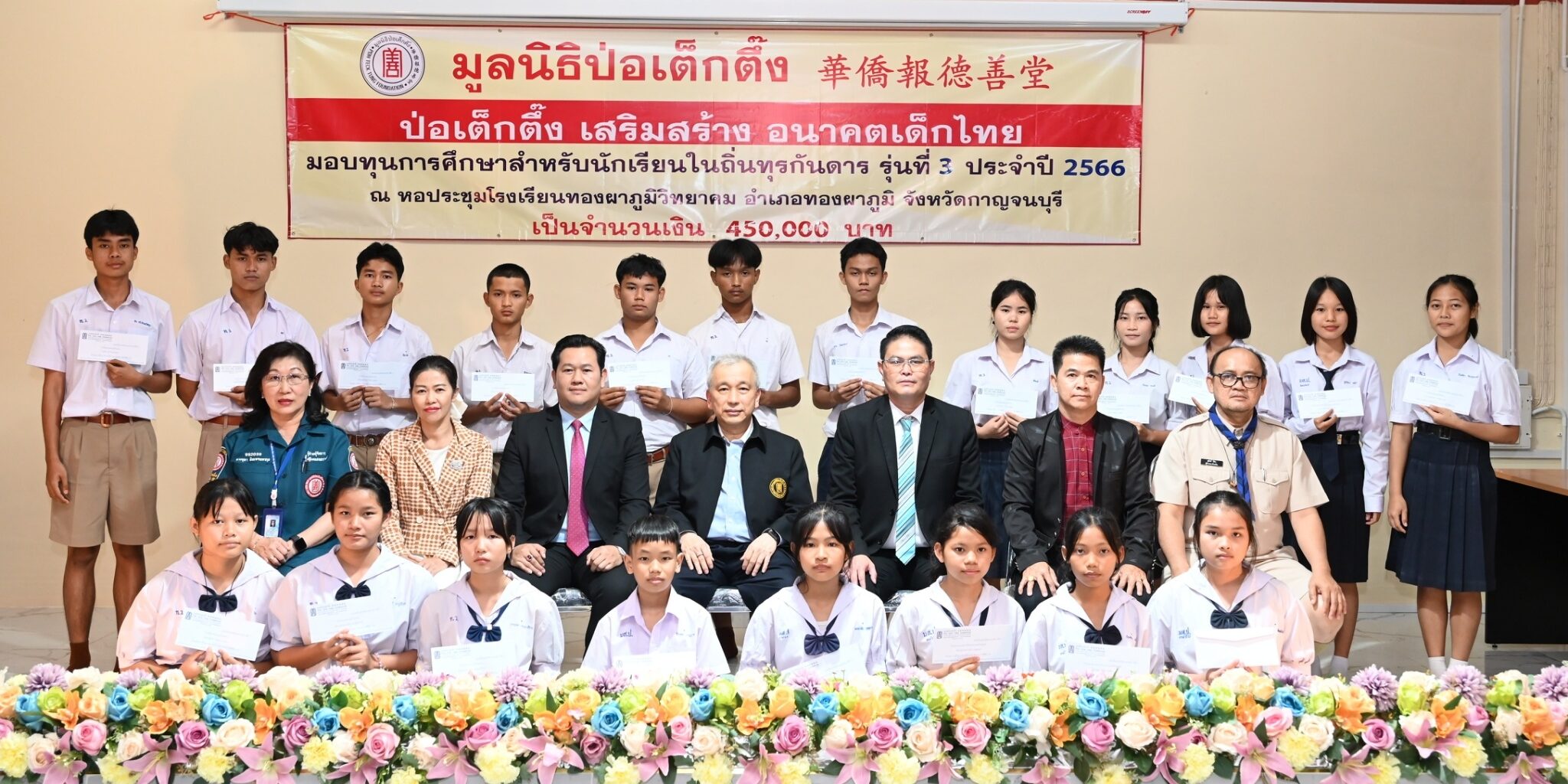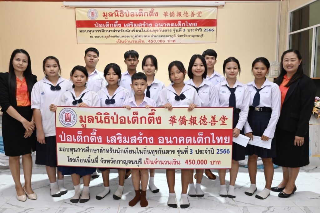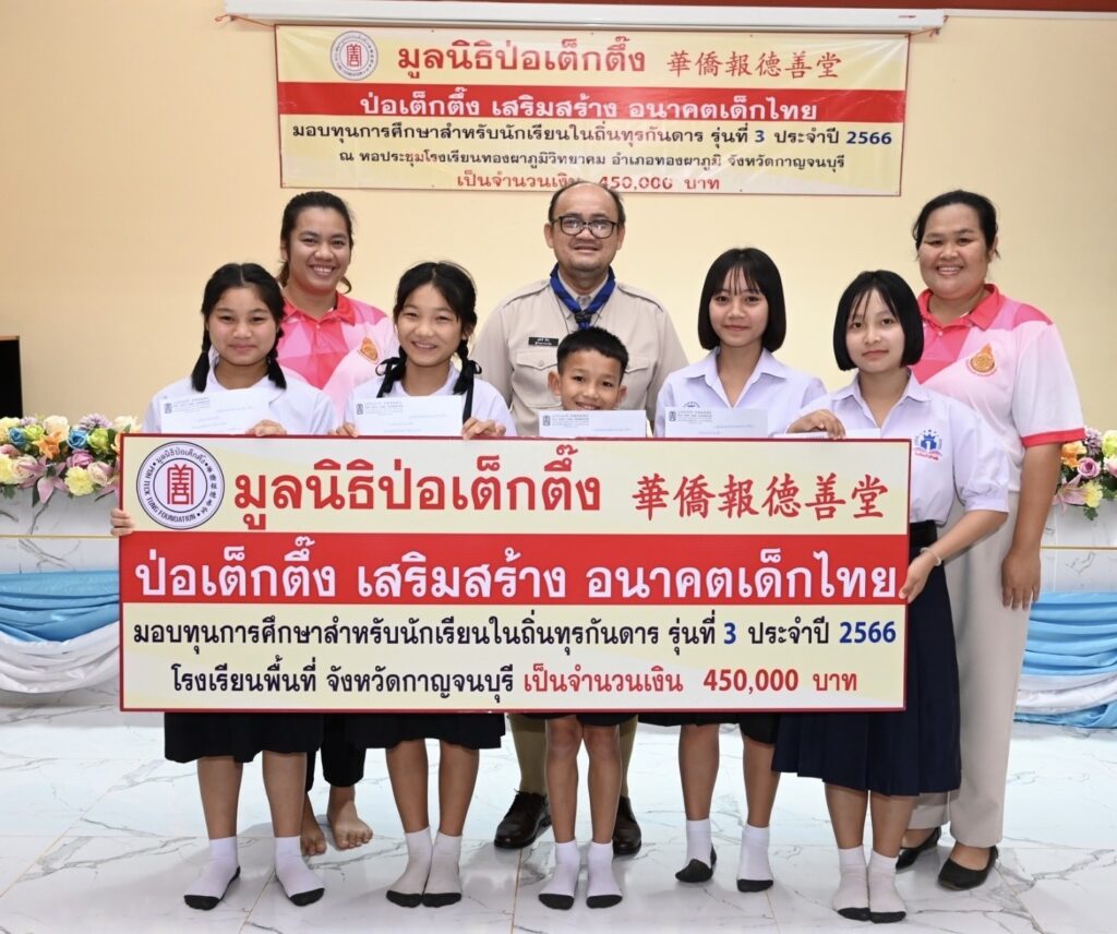 วานนี้ (วันพฤหัสบดีที่ 7 ธันวาคม 2566) มูลนิธิป่อเต็กตึ๊ง นำโดย นายนิพนธ์ ลีละศิธร กรรมการ พร้อมด้วย นางสาวดวงชุตา ติยะพจนพรกุล ผู้ช่วยผู้จัดการฝ่ายสังคมสงเคราะห์ นำทีมแผนกส่งเสริมการศึกษาและอาชีพลงพื้นที่จังหวัดกาญจนบุรี มอบทุนการศึกษาระดับมัธยมศึกษาสำหรับเยาวชนโรงเรียนตำรวจตระเวนชายแดน รุ่นที่ 3 (ครั้งที่ 1) ประจำปี 2566 ประกอบด้วย โรงเรียนราชประชานุเคราะห์ 45 อำเภอพนมทวน โรงเรียนร่มเกล้ากาญจนบุรี (ในพระราชดำริ) โรงเรียนทองผาภูมิวิทยาคม โรงเรียนสมาคมป่าไม้แห่งประเทศไทยอุทิศ โรงเรียนบ้านเกริงกระเวีย โรงเรียนบ้านห้วยเสือ อำเภอทองผาภูมิ และโรงเรียนอุดมสิทธิศึกษา อำเภอสังขละบุรี รวม 7 แห่ง จำนวน 60 ทุน รวมงบประมาณทั้งสิ้น 450,000 บาท (สี่แสนห้าหมื่นบาทถ้วน) นอกจากนี้ มูลนิธิฯ ยังได้มอบผ้าห่มกันหนาวพร้อมขนมให้กับนักเรียนที่เข้ารับมอบทุนฯ โดยจัดพิธีมอบทุนการศึกษา ณ หอประชุม โรงเรียนทองผาภูมิวิทยาคม อำเภอทองผาภูมิ จังหวัดกาญจนบุรี