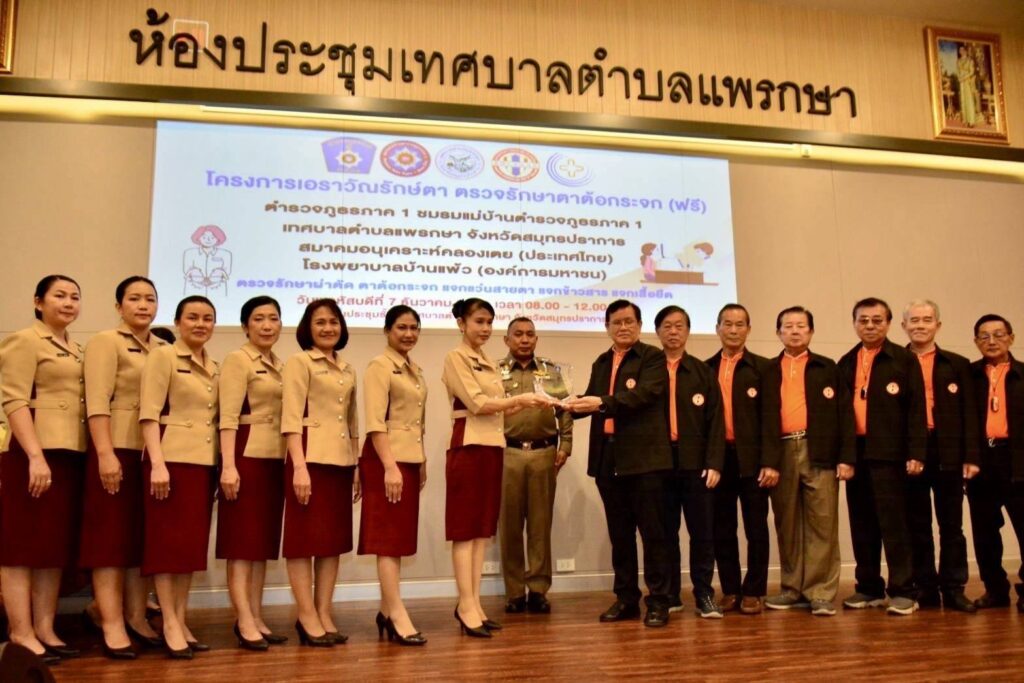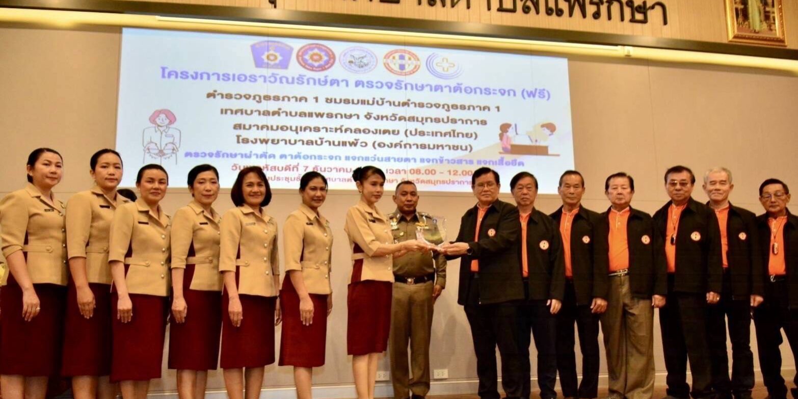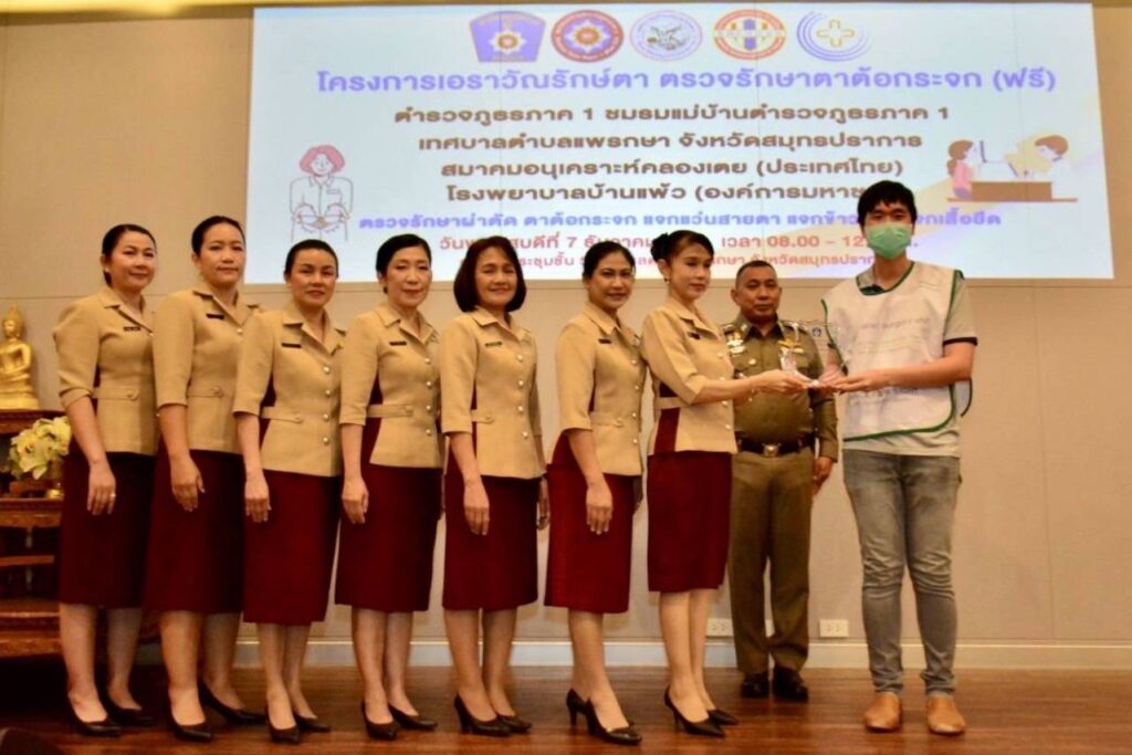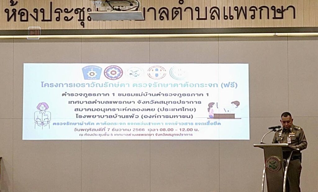 เมื่อวันที่ 7 ธ.ค.2566 ระหว่างเวลา 08.00-12.00 น.: พล.ต.ท.จิรสันต์ แก้วแสงเอก ผบช.ภ.1 พร้อมด้วย คุณวัชรี แก้วแสงเอก ประธานชมรมแม่บ้านตำรวจภูธรภาค 1,พล.ต.ต.วิชิต บุญชินวุฒิกุล ผบก.ภ.จ.สมุทรปราการ,ส.ส.ยงยุทธ สุวรรณบุตร,นางอรัญญา สุวรรณบุตร นายกเทศมนตรีตำบลแพรกษา,คุณสมชาย เอื้ออมรสุข นายกสมาคมอนุเคราะห์คลองเตย (ประเทศไทย),ทีมแพทย์ รพ.บ้านแพ้ว (องค์การมหาชน) และคณะชมรมแม่บ้านตำรวจภูธรภาค 1 ร่วมโครงการ “เอราวัณรักษ์ตา ตรวจรักษาตาต้อกระจก (ฟรี)” ตรวจคัดกรองเพื่อพาผู้ป่วยเข้ารับการผ่าตัดโรคตาต้อกระจก (ฟรี)