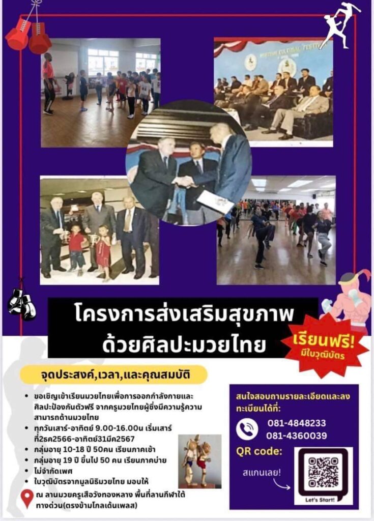 สำหรับโครงการนี้จะมีการสอนมวยไทยฟรีให้กับ เยาวชนและประชาชนทั่วไปทุกวันเสาร์และอาทิตย์เวลา 9.00 น.-12.00 น.เริ่มตั้งแต่วันที่ 3 ธันวาคม 2566 จนถึง 31 มีนาคม 2567 ทางคณะทำงานโครงการ จึงใคร่ขอเชิญชวนเยาวชนและประชาชนทั่วไป มาร่วม “โครงการเสริมสุขภาพด้วยการออกกำลังกายแบบศิลปะป้องกันตัวมวยไทย” ไม่ว่าจะอยู่เขตไหน สามารถลงทะเบียนเรียนได้ฟรี โดยติดต่อประสานงานได้ที่ หมายเลขโทรศัพท์ 081436039