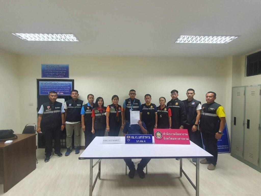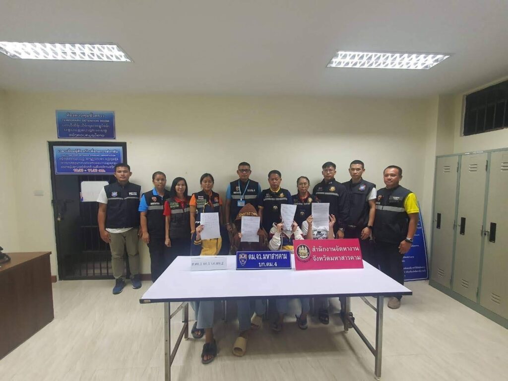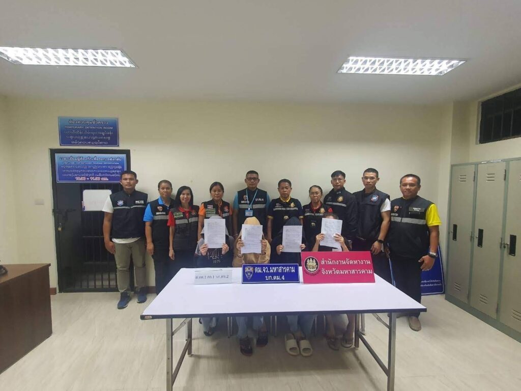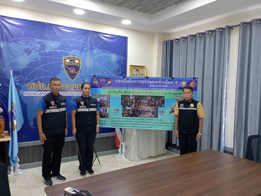 ภายใต้การอํานวยการของ พล.ต.ต.ปิยะอนันต์ โตสกุลวงศ์ ผบก.ตม.4,พ.ต.อ.สิทธิ์ ศิริกังวาลกุล รอง ผบก.ตม.4 และ พ.ต.อ.มณุวัฒน์ กอสนาน รอง ผบก.ตม.4 เจ้าหน้าที่ชุดสืบสวน ตม.จ.มหาสารคาม โดย พ.ต.ต.สุพล ศรีพัก สว.ตม.จ.มหาสารคาม,ร.ต.อ.หญิง ขวัญเรือน แก้วสารพัดนึก รองสว.ตม.จ.มหาสารคาม พร้อมชุดสืบสวนตม.จ.มหาสารคาม บูรณาการร่วมกับจัดหางานจังหวัดมหาสารคาม สํานักงานสวัสดิการและคุ้มครองแรงงานจังหวัดมหาสารคาม,สภ.นาเชือก และ ตํารวจท่องเที่ยวมหาสารคาม (ส.ทท.1กก.1บก.ทท.2) เข้าตรวจสอบร้านจําหน่ายอาหารตามที่ได้รับแจ้งเบาะแสดังกล่าว พบหญิงสาวนั่งอยู่ภายในร้าน จํานวน 8 คน เมื่อเจ้าหน้าที่ ได้ขอตรวจสอบพบว่า เป็นหญิงสัญชาติลาว ซึ่งทั้ง 8 คนได้รับสารภาพว่าเป็นพนักงานคอยเสิร์ฟอาหารประจําร้าน บริการแขก ที่มาเที่ยว โดยเดินทางเข้ามาในไทยด้วยวีซ่านักท่องเที่ยว บางรายลักลอบเดินทางเข้ามาในประเทศไทยทางช่องทางธรรมชาติ แล้วแอบมาทํางาน โดยได้ค่าแรงจากการเสิร์ฟอาหารและบริการแขก ที่นายจ้างจ่ายให้ตอนสิ้นเดือน เจ้าหน้าที่จึงได้เชิญตัวมาที่ทําการ ตม.จ.มหาสารคาม เพื่อตรวจสอบข้อมูลจากระบบสารสนเทศของ สตม. อีกครั้ง และพบว่าคนต่างด้าว จํานวน 3 ราย เดินทางเข้ามาในราชอาณาจักรด้วยวีซ่าประเภทท่องเที่ยว (ผ.ผ.30) อีก 5 ราย ไม่มีเอกสารการเดินทาง แต่กลับแอบมา เป็นแรงงานรับจ้างเป็นพนักงานร้านอาหาร บริการแขก เจ้าหน้าที่ชุดจับกุมจึงแจ้งข้อกล่าวหาให้ทราบว่า “เป็นคนต่างด้าว เดินทางเข้ามาในราชอาณาจักรโดยไม่ได้รับอนุญาต,เป็นคนต่างด้าวเดินทางเข้ามาในราชอาณาจักรโดยไม่ผ่านช่องทาง ด่านตรวจคนเข้าเมือง เขตท่าสถานี หรือท้องที่และตามกําหนดเวลา,เป็นคนต่างด้าวทํางานโดยไม่ได้รับอนุญาตทํางานตาม ม.8 พ.ร.ก.การบริหารจัดการการทํางานคนต่างด้าว พ.ศ.2560 (แก้ไขฉบับที่2) พ.ศ.2561” รวมทั้งจับกุมนายจ้างเจ้าของร้านที่ได้มีการลักลอบจ้างแรงงานต่างด้าวเข้ามาทํางานโดยผิดกฎหมาย ในข้อกล่าวหา “รับคนต่างด้าวทํางานโดยไม่มี ใบอนุญาตทํางาน ตาม ม.9 พ.ร.ก.การบริหารจัดการการทํางานคนต่างด้าว พ.ศ.2560 และ (แก้ไขฉบับที่ 2 ) พ.ศ.2561,ไม่แจ้งการใช้แรงงานเด็กต่อพนักงานตรวจแรงงานตาม พ.ร.บ.คุ้มครองแรงงาน พ.ศ.2541 มาตรา45,นายจ้างจ่ายค่าจ้าง ให้แก่ลูกจ้างน้อยกว่าอัตราค่าจ้างขั้นต่ํา ตามมาตรา 90 วรรค 1 และให้เข้าพักอาศัย ซ่อนเร้นหรือช่วยเหลือด้วยประการ ใดๆ เพื่อให้คนต่างด้าวซึ่งรู้ว่าเข้ามาในราชอาณาจักรโดยฝ่าฝืน พ.ร.บ.คนเข้าเมือง พ.ศ.2522 เพื่อให้พ้นจากการจับกุม ” ผู้ถูกจับทุกรายให้การรับสารภาพตลอดข้อกล่าวหา นําส่งพนักงานสอบสวน สภ.