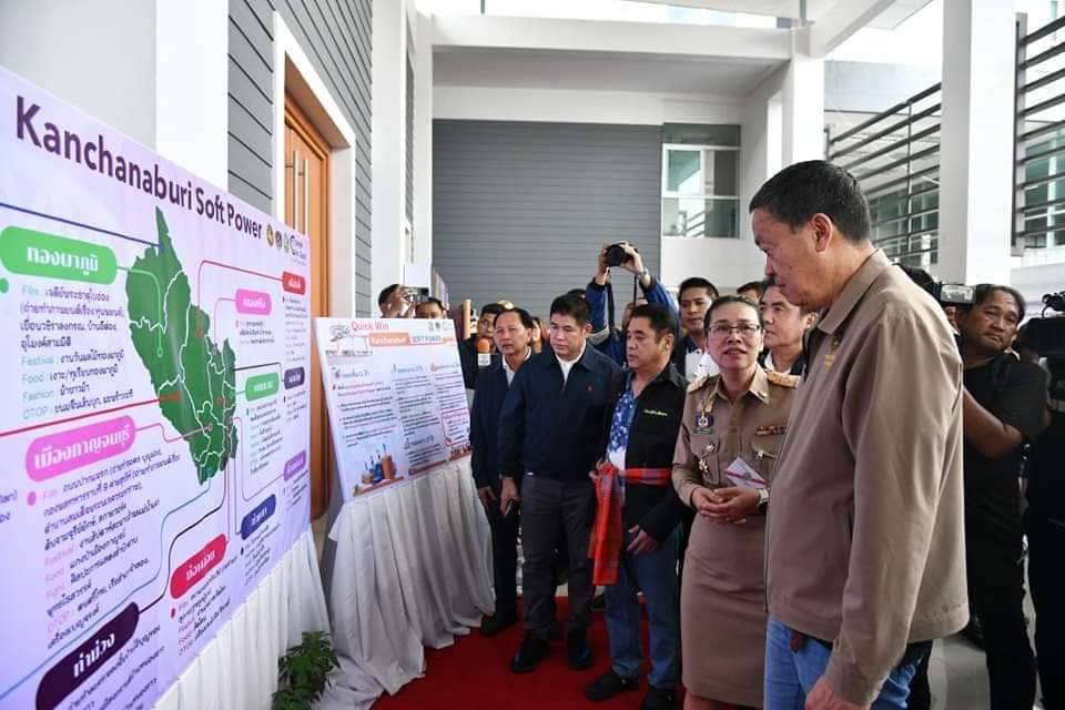 ทั้งนี้นายกรัฐมนตรีได้พบกับประชาชนชาวกาญจนบุรีที่มาคอยให้การต้อนรับ พร้อมเยี่ยมชมนิทรรศการสินค้า OTOP สินค้าวิสาหกิจชุมชนของ จ.กาญจนบุรี จากนั้น นายกรัฐมนตรี และคณะรัฐมนตรีได้รับชมวีดีทัศน์สรุปภาพรวมข้อมูลจังหวัดกาญจนบุรี และรับฟังบรรยายสรุปแนวทางการพัฒนาและแก้ไขปัญหาภาพรวมจังหวัดกาญจนบุรี โดย ร้อยโททศพล ไชยโกมินทร์ ผู้ว่าราชการจังหวัดกาญจนบุรี พร้อมรับฟังแนวทางการพัฒนาด้านการท่องเที่ยว และการส่งเสริมโรงพยาบาลส่งเสริมสุขภาพตำบล (รพ.สต.) ๒๔ ชั่วโมง โดย นายแพทย์ประวัติ กิจธรรมกูลนิจ นายกองค์การบริหารส่วนจังหวัดกาญจนบุรี รวมถึงรับฟังแนวทางการพัฒนาการแก้ไขปัญหาของจังหวัดกาญจนบุรีด้านต่างๆ เช่น ปัญหาที่ดินของจังหวัดกาญจนบุรีนำเสนอโดย ธนารักษ์พื้นที่กาญจนบุรี การแก้ไขปัญหาการบริหารจัดการน้ำ นำเสนอโดย ผู้แทนกรมชลประทาน และการบริหารจัดการน้ำท่วมในพื้นที่อำเภอเมืองกาญจนบุรีนำเสนอโดย ผู้แทนกรมโยธาธิการและผังเมือง