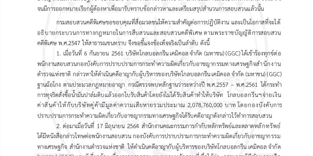 ตามที่ปรากฏข่าวในโซเชียลมีเดีย เมื่อวันที่ 9 ธันวาคม 2566 กล่าวหาว่ากรมสอบสวนคดีพิเศษ “แย่งคดี ปอศ. ช่วยแก๊งสวาปาล์ม” กรณีรับโอนคดีกล่าวหาผู้บริหารของบริษัทโกลบอลกรีน เคมิคอล จำกัด (มหาชน) (GGC) กระทำความผิดอาญาฐานฉ้อโกงตามประมวลกฎหมายอาญา และความผิดตามพระราชบัญญัติหลักทรัพย์และตลาดหลักทรัพย์ พ.ศ.2535 จากกองบังคับการปราบปรามการกระทำความผิดเกี่ยวกับอาชญากรรมทางเศรษฐกิจ (บก.ปอศ) สำนักงานตำรวจแห่งชาติ มาดำเนินการเสียเองทั้งที่คดีใกล้จะเสร็จ จนมีการออกหมายเรียกผู้ต้องหาเพื่อมารับทราบข้อกล่าวหาและเตรียมสรุปสำนวนการสอบสวนแล้วนั้น