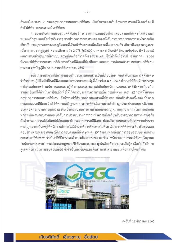 2.ต่อมาเมื่อวันที่ 17 มิถุนายน 2564 สำนักงานคณะกรรมการกำกับหลักทรัพย์และตลาดหลักทรัพย์ ได้มีหนังสือกล่าวโทษต่อพนักงานสอบสวน กองบังคับการปราบปรามการกระทำความผิดเกี่ยวกับอาชญากรรมทางเศรษฐกิจ สำนักงานตำรวจแห่งชาติ ให้ดำเนินคดีอาญากับผู้บริหารของบริษัทโกลบอลกรีน เคมิคอล จำกัด (มหาชน) (GGC) และผู้เกี่ยวข้อง เนื่องจากตรวจสอบพบพยานหลักฐานที่เชื่อได้ว่า กรรมการผู้มีอำนาจหรือผู้บริหารของบริษัท โกลบอลกรีนฯ ในขณะเกิดเหตุ กระทำการเข้าข่ายเป็นความผิดตามพระราชบัญญัติหลักทรัพย์และตลาดหลักทรัพย์ พ.ศ.2535 อันมีข้อเท็จจริงแห่งคดีเดียวกัน จึงรวมการสอบสวนเป็นสำนวน การสอบสวนเดียว